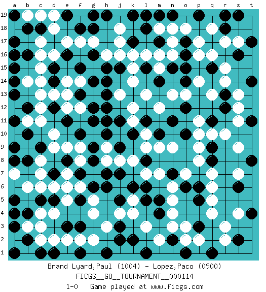 Last move : 1-0 2023 December 25 14:59:42 [Event "FICGS__GO__TOURNAMENT__000114"] [Site "FICGS"] [Date "2023.06.01"] [Round "1"] [Black "Brand Lyard,Paul"] [White "Lopez,Paco"] [Result "1-0"] [Rating 1 "1004"] [Rating 2 "0900"] 1.n7 d16 2.f10 q16 3.g6 d4 4.k13 q4 5.d12 c13 6.f15 n17 7.d14 c14 8.b8 c6 9.e8 o3 10.q11 q13 11.j9 g17 12.g12 g4 13.c18 c17 14.a15 b14 15.k17 f17 16.k6 k4 17.b10 c11 18.n11 n13 19.h15 m15 20.k10 q7 21.b2 c3 22.r18 q18 23.f13 r10 24.e19 d18 25.t14 s13 26.s16 j17 27.a17 n5 28.c9 p9 29.f5 j16 30.b18 d19 31.h1 g2 32.h7 n9 33.l18 j18 34.h13 e6 35.a5 b6 36.o14 o13 37.k2 l3 38.g11 d13 39.d1 d2 40.e3 e2 41.l11 l13 42.d15 c15 43.h11 k14 44.g8 l7 45.t11 s9 46.e16 e17 47.a11 b11 48.e11 d10 49.j5 j4 50.g14 j13 51.j11 k12 52.g9 d9 53.p6 q6 54.s2 r3 55.n19 o18 56.b4 b3 57.g19 e13 58.k19 k16 59.l8 m7 60.o16 n16 61.o12 m12 62.q15 p16 63.g16 e14 64.n2 o2 65.j2 h3 66.t17 r15 67.s6 s7 68.t4 r2 69.f7 e7 70.s19 p11 71.a16 c19 72.m10 m9 73.l1 m2 74.a13 a7 75.j7 k8 76.h19 m18 77.b16 c16 78.m5 n6 79.q1 l9 80.p19 r17 81.m17 n18 82.t8 k11 83.d5 e5 84.f18 s17 85.a19 j8 86.r19 e12 87.o1 h8 88.l19 h9 89.a8 l10 90.a9 f14 91.q8 p8 92.j15 e9 93.c5 d6 94.j3 f12 95.m4 h16 96.g18 g5 97.h10 f6 98.a1 f9 99.b12 c12 100.c1 f8 101.f1 f2 102.n15 p14 103.p5 q5 104.d7 c7 105.a4 b19 106.l15 k15 107.a3 c4 108.h6 n4 109.h14 s11 110.m14 m16 111.h12 s4 112.o10 p10 113.m19 l16 114.f3 c2 115.o6 o7 116.a14 c8 117.r12 s12 118.o17 p17 119.l5 k5 120.p3 p2 121.o15 r14 122.q9 q10 123.l6 n3 124.r13 1-0 This go game has been lost on time (started : 2023.06.01 19:55:45) Follow this game move after move (download)Only amateurs try to come up with fancy moves. (Anonymous) Either move or be moved. (Ezra Pound)