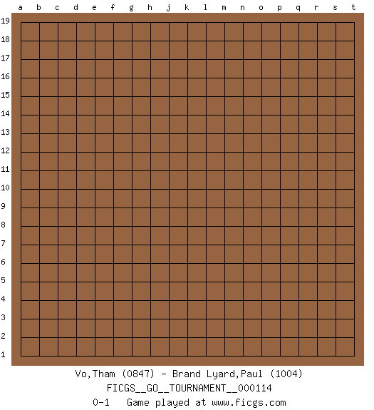 Last move : 0-1 2023 July 1 23:44:0 [Event "FICGS__GO__TOURNAMENT__000114"] [Site "FICGS"] [Date "2023.06.01"] [Round "1"] [Black "Vo,Tham"] [White "Brand Lyard,Paul"] [Result "0-1"] [Rating 1 "0847"] [Rating 2 "1004"] 0-1 This go game has been lost on time (started : 2023.06.01 19:55:45) Follow this game move after move (download)One big eye kills one small eye. (Anonymous) The difference between stupidity and genius is that genius has its limits. (Murphy)