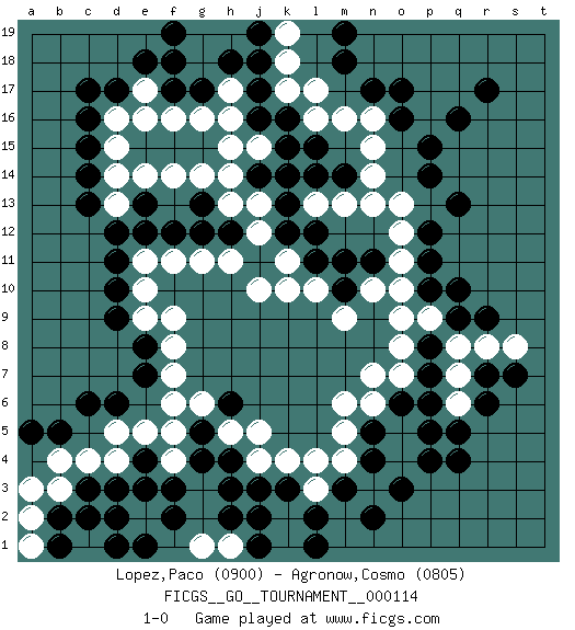 Last move : 1-0 2023 October 25 17:18:5 [Event "FICGS__GO__TOURNAMENT__000114"] [Site "FICGS"] [Date "2023.06.01"] [Round "1"] [Black "Lopez,Paco"] [White "Agronow,Cosmo"] [Result "1-0"] [Rating 1 "0900"] [Rating 2 "0805"] 1.q4 d16 2.q16 d4 3.f3 f5 4.g5 n16 5.o17 o13 6.r7 o7 7.n4 k4 8.q10 o10 9.q13 m6 10.c14 e14 11.d12 f11 12.d9 f9 13.j3 j4 14.h4 h5 15.g4 g6 16.e4 e5 17.d3 c4 18.d6 d5 19.c6 f6 20.f17 g16 21.d17 e16 22.c17 e17 23.e18 f16 24.g17 h17 25.h18 g18 26.f18 h19 27.j18 l17 28.j17 h16 29.j16 j15 30.k16 l16 31.k15 k14 32.l15 m16 33.l14 l13 34.m14 m13 35.j14 h15 36.k13 n14 37.p15 n15 38.k12 k10 39.g13 h13 40.h12 h14 41.f12 g11 42.j11 k11 43.l12 n13 44.p12 o12 45.d11 j13 46.k14 j12 47.g12 h11 48.e13 e11 49.p8 o8 50.p6 g19 51.j19 d13 52.e12 e10 53.d10 e9 54.k3 l3 55.m3 l4 56.n5 n6 57.o6 n7 58.c13 d14 59.c16 d15 60.l11 l10 61.n11 o11 62.p11 n10 63.m10 m9 64.m11 k18 65.c15 f14 66.h6 j5 67.n17 k19 68.f19 g14 69.e8 f8 70.e7 f7 71.l2 m4 72.n2 q7 73.p7 q8 74.q9 r8 75.r6 q6 76.q5 p9 77.r9 s8 78.s7 o9 79.c3 b3 80.b5 b4 81.p14 f4 82.e3 c2 83.d2 c1 84.d1 g3 85.h3 g2 86.f2 f1 87.b2 e2 88.b1 a2 89.m18 k17 90.m19 a3 91.a5 g1 92.h2 h1 93.j1 k2 94.e1 a1 95.o16 j10 96.r17 o5 97.p5 o4 98.o3 c1 99.c2 m5 100.p4 k1 101.l1 g1 102.p10 h1 103.j2 1-0 Follow this game move after move (download)You can hide nothing on the goban. (Pierre Audouard) When the going gets tactical, the computers get going. (Hyatt)