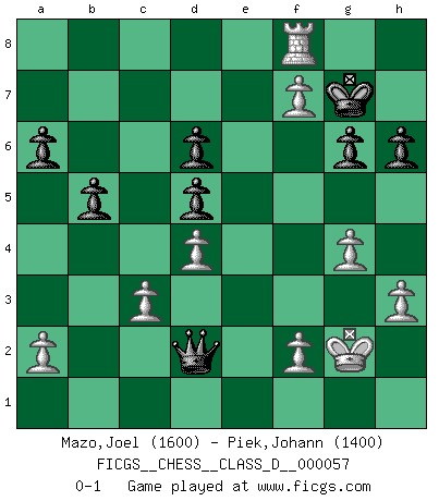 Last move : 0-1 2007 November 24 19:45:22 [Event "FICGS__CHESS__CLASS_D__000057"] [Site "FICGS"] [Date "2007.09.01"] [Round "1"] [White "Mazo,Joel"] [Black "Piek,Johann"] [Result "0-1"] [WhiteElo "1600"] [BlackElo "1400"] 1.e4 e5 2.Nf3 Nc6 3.Bb5 a6 4.Ba4 Nf6 5.O-O Be7 6.Qe2 b5 7.Bb3 O-O 8.c3 d6 9.d4 Bg4 10.Rd1 exd4 11.cxd4 d5 12.e5 Ne4 13.h3 Bf5 14.Nc3 Nxc3 15.bxc3 Na5 16.Bc2 Qd7 17.Bxf5 Qxf5 18.Re1 Rfe8 19.g4 Qe6 20.Bg5 Bxg5 21.Nxg5 Qh6 22.Qd2 Nc4 23.Qc1 f6 24.exf6 Rxe1+ 25.Qxe1 Qxg5 26.Qe6+ Kh8 27.f7 Nd6 28.Re1 Rf8 29.Kg2 h6 30.Re5 Qd2 31.Qxd6 cxd6 32.Re8 g6 33.Rxf8+ Kg7 0-1 Ruy Lopez : Worrall attack, sharp line Kingside Castling by player White (move 5) Kingside Castling by player Black (move 7) Player Black won this chess game. Follow this game move after move (download)Chess is a more highly symbolic game, but the aggressions are therefore even more frankly represented in the play. It probably began as a war game; that is, the representation of a miniature battle between the forces of two kingdoms. (Karl Meninger) Frage: Was machen Sie mit den Preisen? Anwort: Ich habe Angst, dass meine Freundin davon neue Kleider kauft. (Loek van Wely) El Ajedrez es despiadado: debes de estar preparado para matar gente. (Nigel Short) Vouloir jouer aux échecs contre soi-même est aussi paradoxal que vouloir marcher sur son ombre. (Stefan Zweig) Empty your mind, be formless, shapeless — like water. (Bruce Lee)