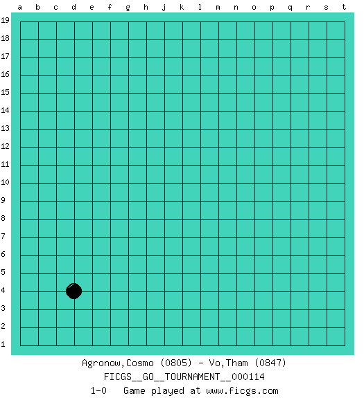 Last move : 1-0 2023 July 1 23:44:0 [Event "FICGS__GO__TOURNAMENT__000114"] [Site "FICGS"] [Date "2023.06.01"] [Round "1"] [Black "Agronow,Cosmo"] [White "Vo,Tham"] [Result "1-0"] [Rating 1 "0805"] [Rating 2 "0847"] 1.d4 1-0 This go game has been lost on time (started : 2023.06.01 19:55:45) Follow this game move after move (download)More haste less speed. (John Fairbairn) Fear is the path to the dark side. Fear leads to anger; anger leads to hate; hate leads to suffering. I sense much fear in you. (Master Yoda in Star Wars ep.1)