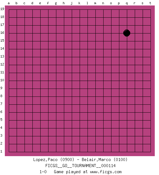 Last move : 1-0 2023 July 1 23:44:0 [Event "FICGS__GO__TOURNAMENT__000114"] [Site "FICGS"] [Date "2023.06.01"] [Round "1"] [Black "Lopez,Paco"] [White "Belair,Marco"] [Result "1-0"] [Rating 1 "0900"] [Rating 2 "0100"] 1.q16 1-0 This go game has been lost on time (started : 2023.06.01 19:55:45) Follow this game move after move (download)Don't make empty triangles. (Anonymous) CHESS, n. f. [echecs, Fr.] A nice and abstruse game, in which two sets of puppets are moved in opposition to each other. (Dr Samuel Johnson, A Dictionary Of The English Language, 1755)