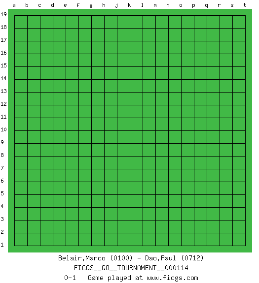 Last move : 0-1 2023 July 1 23:44:0 [Event "FICGS__GO__TOURNAMENT__000114"] [Site "FICGS"] [Date "2023.06.01"] [Round "1"] [Black "Belair,Marco"] [White "Dao,Paul"] [Result "0-1"] [Rating 1 "0100"] [Rating 2 "0712"] 0-1 This go game has been lost on time (started : 2023.06.01 19:55:45) Follow this game move after move (download)If you have lost four corners, resign. (Anonymous) Employ the attack like tactic of defense. (Chinese proverb)