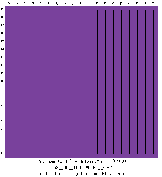 Last move : 0-1 2023 July 1 23:44:0 [Event "FICGS__GO__TOURNAMENT__000114"] [Site "FICGS"] [Date "2023.06.01"] [Round "1"] [Black "Vo,Tham"] [White "Belair,Marco"] [Result "0-1"] [Rating 1 "0847"] [Rating 2 "0100"] 0-1 This go game has been lost on time (started : 2023.06.01 19:55:45) Follow this game move after move (download)For rectangular six in the corner, dame is necessary. (Anonymous) You must do what you feel is right... of course. (Obi-Wan Kenobi in Star Wars ep.4)