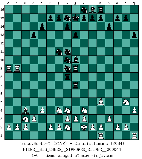 Last move : 1-0 2023 June 3 3:12:18 [Event "FICGS__BIG_CHESS__STANDARD_SILVER__000044"] [Site "FICGS"] [Date "2023.06.02"] [Round "1"] [White "Kruse,Herbert"] [Black "Cirulis,Ilmars"] [Result "1-0"] [WhiteElo "2192"] [BlackElo "2084"] 1.j2-k4 j15-h13 2.h1-o7 n15-n14 3.o7-c7 h16-k14 4.c7-c15 k14-f10 5.c15-l7 o16-g9 6.h2-g4 d15-d13 7.n2-n3 c16-j10 8.k1-h2 e16-c16 9.b1-c3 c16-c7 10.l7-l6 e15-e14 11.g1-j2 f16-d14 12.e2-e4 d14-j9 13.f1-b5 c7-l7 14.l6-g10 b16-d15 15.g10-f10 g9-f10 16.p1-o3 a16-c16 17.k2-k3 c16-c8 18.l1-k2 d15-f14 19.k2-n5 l7-l9 20.d2-d3 l9-o9 21.n5-j9 o9-j9 22.c1-f4 p16-o14 23.f4-e5 f10-h8 24.o1-e10 c8-f8 25.e5-h8 f8-h8 26.q2-q4 h13-g11 27.e10-l4 o14-n12 28.e1-e3 n12-l11 29.e3-f3 g16-j15 30.f3-f11 j15-h13 31.f11-c11 f14-e12 32.c11-c16 j16-j15 33.a1-e1 e12-g13 34.e1-e3 a15-a13 35.e3-f3 b15-b14 36.f3-f6 l11-k9 37.f6-b6 g11-h9 38.b6-b14 q15-q13 39.c16-a16 q16-q14 40.a16-a13 q14-p14 41.o3-p5 p14-p7 42.a13-a9 p7-j7 43.b14-b9 k9-h10 44.b5-c4 h13-g11 45.l4-m5 g13-h11 46.j1-k2 j14-j13 47.j2-h4 1-0 Follow this game move after move (download)It is not a move, even the best move that you must seek, but a realizable plan. (Eugene Znosko-Borovsky) Obendrein hat der FIDE-Präsident den Revolutionsführer Gaddafi zum »Großmeister« ernannt, am Ende der WM. Das ist lächerlich! (Joel Lautier) Uno no tiene que jugar muy bien, es suficiente jugar mejor que el oponente. (Siegbert Tarrasch) Roi des jeux et jeu des rois, les échecs portent en eux un sentiment d'infini. Ils donnent à celui qui s'est efforcé d'en approfondir les arcanes l'impression de n'être pas à la mesure de l'homme; en fait, ils constituent un résumé de l'univers, un microcosme, et figurent cette grande échelle qui, dans les plans de la lumière descend jusqu'à la matière, qui des abîmes insondables remonte jusqu'en l'infini de Dieu. (Pyrame) We cannot be sure of having something to live for unless we are willing to die for it. (Ernesto Che Guevara)