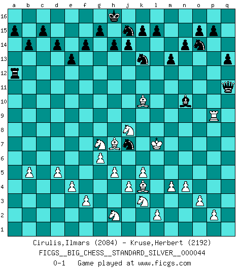 Last move : 0-1 2023 June 4 15:28:41 [Event "FICGS__BIG_CHESS__STANDARD_SILVER__000044"] [Site "FICGS"] [Date "2023.06.02"] [Round "2"] [White "Cirulis,Ilmars"] [Black "Kruse,Herbert"] [Result "0-1"] [WhiteElo "2084"] [BlackElo "2192"] 1.j2-k4 m15-m13 2.h1-o7 h15-g13 3.d2-d3 j15-k13 4.n2-n4 p16-o14 5.c1-k8 e15-e13 6.o7-j7 h16-o10 7.h3-h4 k16-h15 8.b1-c3 b16-c14 9.o2-o3 f16-b12 10.o1-h7 l16-p12 11.g2-g4 n15-n14 12.f1-j4 o16-f8 13.g1-h3 o10-b10 14.a1-b1 b10-b8 15.k4-h5 f8-h6 16.j7-h6 b12-h6 17.k8-h6 d15-d14 18.m2-m4 c16-l8 19.l1-o4 l8-j6 20.h7-j6 p12-j6 21.g4-g5 e16-e14 22.o4-k8 e14-f14 23.c3-e4 b8-a8 24.a2-a3 j6-p12 25.e4-f6 m16-m14 26.e2-e4 m14-l14 27.e1-e3 l14-l8 28.k8-j7 l8-c8 29.c2-c4 c8-b8 30.p1-n2 b8-b3 31.k1-l3 a8-b9 32.j1-j2 f14-f11 33.m1-g1 f11-d11 34.f6-d5 b3-b7 35.b2-b4 d11-a11 36.b1-b3 b7-a7 37.d3-d4 b9-c10 38.d5-f6 c10-c4 39.d4-d5 c4-c12 40.l3-k5 c12-a14 41.g1-g3 q16-m16 42.k2-k3 m16-m14 43.h5-g7 m14-l14 44.n2-l3 l14-l10 45.q1-c1 l10-a10 46.c1-c3 a14-e10 47.c3-c9 a7-a9 48.b3-c3 a9-c9 49.c3-c9 e10-a14 50.c9-b9 a16-b16 51.b9-j9 a10-a3 52.e3-a3 a11-a3 53.g3-a3 a14-a3 54.b4-b5 c14-d12 55.k5-l7 b16-e16 56.l7-j8 e16-e14 57.j4-e8 g16-j15 58.e8-f9 e14-f14 59.l3-j4 b15-b14 60.f6-g8 p12-o13 61.j4-k6 a3-d3 62.f2-f3 o13-p12 63.h4-h5 d3-b1 64.h3-j1 h15-j13 65.g8-f10 f14-f11 66.q2-q4 f11-a11 67.h6-l3 a11-a1 68.j2-h3 p12-q11 69.j3-j4 b1-h1 70.k3-k4 a1-a3 71.h3-j3 a3-a2 72.j1-k3 h1-m1 73.k3-j1 a2-a1 74.j3-j2 m1-q1 75.j9-p9 q11-p12 76.j7-l9 q15-q13 77.g5-g6 q1-l1 78.k4-k5 l1-b10 79.f10-h9 a1-a2 80.j1-h3 j13-k11 81.l9-k10 b10-l1 82.h3-j1 l1-h4 83.l3-k4 h4-f2 84.j2-h3 f2-g1 85.j1-k3 g1-g2 86.h3-h4 k11-h10 87.j8-h10 g2-f2 88.h4-g5 f2-k6 89.g7-j8 k6-g3 90.g5-f5 d12-f11 91.h10-f11 g13-f11 92.h9-g7 j16-h16 93.p9-j9 g3-h3 94.f5-f6 h3-j2 95.j9-l9 j2-k2 96.f6-e6 p12-n10 97.f9-c12 n10-l12 98.e6-f5 k2-j2 99.f5-g5 f15-f14 100.g5-h6 j2-c8 101.c12-h7 f11-h10 102.h6-j6 l12-n10 103.j6-j7 h10-g8 104.j7-k8 c8-g12 105.k8-l7 g12-q12 106.l7-m7 q12-q11 107.m7-m8 g8-j7 108.l9-p9 q11-q4 109.m8-m7 q4-q11 110.m7-l7 a2-a12 0-1 Follow this game move after move (download)Strategy requires thought, tactics require observation. (Max Euwe) Irgendwie scheint mir sonntags früh um 9 Uhr der Killerinstinkt verloren gegangen zu sein. (Alexej Shirov) Después de la respuesta de las negras a 1.e4 con 1..e5, se quedan siempre tratando de entrar dentro del juego. (Howard Staunton) Tout change constamment, y compris dans le monde des Echecs. (Botvinnik) When you stop learning you start dying. (Scott Adams)