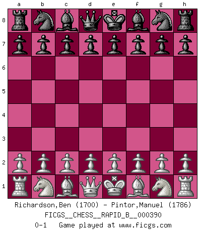 Last move : 0-1 2023 July 4 12:57:40 [Event "FICGS__CHESS__RAPID_B__000390"] [Site "FICGS"] [Date "2023.06.04"] [Round "1"] [White "Richardson,Ben"] [Black "Pintor,Manuel"] [Result "0-1"] [WhiteElo "1700"] [BlackElo "1786"] 0-1 This chess game has been lost on time (started : 2023.06.04 8:51:31) Follow this game move after move (download)Many have become Chess Masters, no one has become the Master of Chess. (Siegbert Tarrasch) Stelle das Brett so, daß die Sonne in die Augen deines Gegners scheint. (Ruy López) Aquel que toma al Peón de Caballo de la Reina, se pasará la noche a dormir en la calle. (Anónimo) Des points faibles ou des trous dans la position de l'adversaire doivent être occupés par des pièces et non pas par des pions. (Siegbert Tarrasch) Work expands to fill the time available. (C. Northcote Parkinson, in Parkinson's Laws)