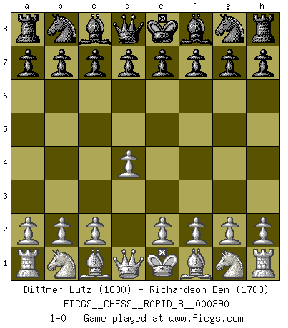 Last move : 1-0 2023 July 6 2:2:41 [Event "FICGS__CHESS__RAPID_B__000390"] [Site "FICGS"] [Date "2023.06.04"] [Round "1"] [White "Dittmer,Lutz"] [Black "Richardson,Ben"] [Result "1-0"] [WhiteElo "1800"] [BlackElo "1700"] 1.d4 1-0 This chess game has been lost on time (started : 2023.06.04 8:51:31) Follow this game move after move (download)An attack on the wing should be met by play in the center. (Nimzovitch) Garry Kasparov war erst in der Großmeister-Organisation GMA, dann in der Profischach-Vereinigung PCA, zum Schluss kehrte er wieder in den Schoß der FIDE zurück. Aber gut, manche Leute sind flexibel (Viswanathan Anand) Repentinamente, me resultaba obvio en mi analisis que yo había pasado por alto lo que Fischer había visto en el tablero con la mas grande facilidad. (Mikhail Botvinnik) Les Echecs sont affaire de jugement sensible. Savoir quand frapper et quand esquiver. (Fischer) All the troubles of the world come from being unable to sit alone in a quiet room. (Blaise Pascal)
