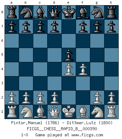 Last move : 1-0 2023 July 7 2:38:23 [Event "FICGS__CHESS__RAPID_B__000390"] [Site "FICGS"] [Date "2023.06.04"] [Round "1"] [White "Pintor,Manuel"] [Black "Dittmer,Lutz"] [Result "1-0"] [WhiteElo "1786"] [BlackElo "1800"] 1.e4 e5 2.f4 1-0 This chess game has been lost on time (started : 2023.06.04 8:51:31) Follow this game move after move (download)All that matters on the Chessboard is good moves. (Bobby Fischer) Wer nie einen Fehler gemacht hat, hat nie etwas Neues ausprobiert. (Albert Einstein) La caracteristica mas importante en la posición del Ajedrez es la actividad de las piezas. Esto es absolutamente fundamental en todas las fases del juego: Apertura, Juego Medio y especialmente Finales. La limitación primordial en la actividad de una pieza, es la estructuración de los Peones. (Michael Stean) Horreur, mais aussi harmonie suprême : qu'y avait-il en effet au monde en dehors des échecs ? Le brouillard, l'inconnu, le non-être... (Vladimir Nabokov) It's unlucky to be superstitious. (Dave Enteles)