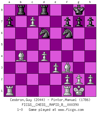 Last move : 1-0 2023 July 15 3:13:49 [Event "FICGS__CHESS__RAPID_B__000390"] [Site "FICGS"] [Date "2023.06.04"] [Round "1"] [White "Cesbron,Guy"] [Black "Pintor,Manuel"] [Result "1-0"] [WhiteElo "2044"] [BlackElo "1786"] 1.d4 d5 2.c4 c6 3.Nf3 Bf5 4.Nc3 e6 5.e3 Bb4 6.Qb3 Qb6 7.c5 Qa5 8.Be2 Nf6 9.O-O b5 10.a4 Bxc3 11.bxc3 O-O 12.Bd2 bxa4 13.Qb7 Nbd7 14.Qxc6 Qd8 15.Qxa4 Ne4 16.c4 Bg4 17.Ba5 Qe7 18.cxd5 exd5 19.c6 Ndf6 20.Bb4 Nd6 21.Qa5 Bxf3 22.Bxf3 Rfc8 23.Bxd5 Rab8 24.Bf3 Qd8 25.Qxd8+ Rxd8 26.c7 1-0 Follow this game move after move (download)By playing at Chess then, we may learn: First: Foresight... Second: Circumspection... Third: Caution... And lastly, we learn by Chess the habit of not being discouraged by present bad appearances in the state of our affairs, the habit of hoping for a favorable chance, and that of persevering in the secrets of resources. (Benjamin Franklin) Es ist besser die Steine des Gegners zu opfern. (Savielly Grigorievitsch Tartakower) No hay precio que sea tan grande por la cabellera del Rey enemigo. (Koblentz) Si je n'étais pas joueur d'échecs, je serais le meilleur dans quelque chose d'autre. (Anatoli Karpov) Looking at the proliferation of personal web pages on the Net, it looks like very soon everyone on Earth will have 15 megabytes of fame. (M.G. Sriram)