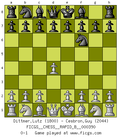 Last move : 0-1 2023 July 7 2:38:23 [Event "FICGS__CHESS__RAPID_B__000390"] [Site "FICGS"] [Date "2023.06.04"] [Round "1"] [White "Dittmer,Lutz"] [Black "Cesbron,Guy"] [Result "0-1"] [WhiteElo "1800"] [BlackElo "2044"] 1.d4 Nf6 0-1 This chess game has been lost on time (started : 2023.06.04 8:51:31) Follow this game move after move (download)Fischer prefers to enter Chess history alone. (Miguel Najdorf) Sicherlich können nur Meister einen Stil haben. Daß ein nicht-Meister auch nur ein einziges Mal in seinem Leben eine Partie folgerecht durchführte, habe ich niemals bemerkt. (Emanuel Lasker) Un entendimiento a fondo de las continuaciones típicas del mate, hace de las combinaciones de sacrificio mas complicadas conducirlas a ellas no solo sin dificultad, sino casi de una manera natural. (Siegbert Tarrasch) Aidez vos pièces, elles vous aideront. (Paul Morphy) Have no fear of perfection - you'll never reach it. (Salvador Dali)