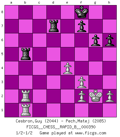 Last move : 1/2-1/2 2023 September 10 2:3:10 [Event "FICGS__CHESS__RAPID_B__000390"] [Site "FICGS"] [Date "2023.06.04"] [Round "1"] [White "Cesbron,Guy"] [Black "Pech,Matej"] [Result "1/2-1/2"] [WhiteElo "2044"] [BlackElo "2085"] 1.d4 Nf6 2.c4 g6 3.Nc3 d5 4.cxd5 Nxd5 5.e4 Nxc3 6.bxc3 Bg7 7.Nf3 c5 8.Rb1 O-O 9.Be2 cxd4 10.cxd4 Qa5+ 11.Bd2 Qxa2 12.O-O Bg4 13.Bg5 h6 14.Be3 Nc6 15.d5 Ne5 16.Rxb7 a5 17.Rxe7 a4 18.Bd4 Nxf3+ 19.Bxf3 Bxf3 20.gxf3 Bxd4 21.Qxd4 a3 22.Kg2 Qb2 23.Qxb2 axb2 24.Rb1 Rfb8 25.d6 Kf8 26.Rc7 Rb5 27.d7 Rd8 28.Rc2 Rxd7 29.Rcxb2 1/2-1/2 Follow this game move after move (download)I played Chess with him and would have beaten him sometimes only he always took back his last move, and ran the game out differently. (Mark Twain) Im Reiche der Wirklichkeit ist man nie so glücklich wie im Reiche der Gedanken. (Arthur Schopenhauer) Hoy en día, si tu no eres un Gran Maestro a los 14 años, es mejor que lo olvides. (Anand Viswanathan) Votre seul travail dans les ouvertures est d'obtenir un milieu de partie jouable. (Lajos Portish) The absolute truth is the thing that makes people laugh. (Carl Reiner)