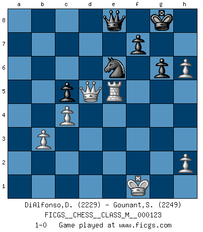 Last move : 1-0 2023 June 23 22:29:18 [Event "FICGS__CHESS__CLASS_M__000123"] [Site "FICGS"] [Date "2023.06.04"] [Round "1"] [White "DiAlfonso,Darren"] [Black "Gounant,Stanislas"] [Result "1-0"] [WhiteElo "2229"] [BlackElo "2249"] 1.d4 b6 2.e4 e6 3.c3 c5 4.Bd3 Bb7 5.Nf3 Nf6 6.Qe2 Be7 7.e5 Nd5 8.c4 Nc7 9.dxc5 bxc5 10.Nc3 Bxf3 11.Qxf3 Nc6 12.Qg3 O-O 13.Be4 Bh4 14.Qh3 Nxe5 15.Bxa8 Nxa8 16.b3 Bf6 17.O-O Nc6 18.Bf4 d6 19.Rad1 Nd4 20.Be3 Qb6 21.f4 Nc7 22.g4 Rd8 23.Ne4 Be7 24.f5 d5 25.f6 dxe4 26.fxe7 Re8 27.Qg2 e5 28.Qxe4 Rxe7 29.g5 Qe6 30.Rde1 g6 31.Bf2 Qc8 32.Bg3 Qe8 33.Rf6 a5 34.Kf1 a4 35.Rb6 axb3 36.axb3 Re6 37.Rxe6 Ncxe6 38.Qd5 Nc6 39.Bxe5 Nxe5 40.Rxe5 h6 41.gxh6 1-0 Follow this game move after move (download)Examine moves that smite! A good eye for smites is far more important than a knowledge of strategical principles. (Purdy) Privat ist Kortschnoi kein schlechter Mensch, sehr sympathisch. Aber während des Spiels ist er grausam. Er will dich töten. (Miguel Najdorf) Las piezas de Ajedrez son los bloques del alfabeto que moldean los pensamientos; y esos pensamientos, aunque hagan un diseño visual en el tablero, expresan abstractamente su belleza como un poema. (Marcel Duchamp) La tactique, c'est ce que vous faites quand il y a quelque chose à faire; la stratégie, c'est ce que vous faites quand il n'y a rien à faire. (Savielli Tartacower) If you ain't just a little scared when you enter a casino, you are either very rich or you haven't studied the games enough. (Pappy)