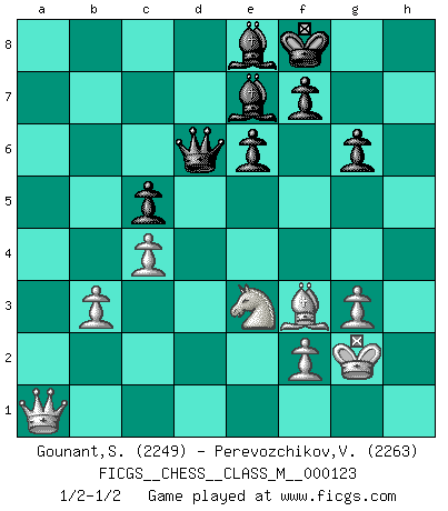 Last move : 1/2-1/2 2023 July 6 20:48:40 [Event "FICGS__CHESS__CLASS_M__000123"] [Site "FICGS"] [Date "2023.06.04"] [Round "1"] [White "Gounant,Stanislas"] [Black "Perevozchikov,Vjacheslav"] [Result "1/2-1/2"] [WhiteElo "2249"] [BlackElo "2263"] 1.e4 e6 2.d3 d5 3.Nd2 c5 4.Ngf3 Nc6 5.g3 Nf6 6.Bg2 Be7 7.O-O O-O 8.Re1 b5 9.e5 Nd7 10.Nf1 a5 11.h4 Bb7 12.a4 bxa4 13.Rxa4 Qc7 14.c3 Rfb8 15.N1h2 Ncxe5 16.Nxe5 Nxe5 17.Rxe5 Qxe5 18.Bf4 Qf5 19.Bxb8 Rxb8 20.Rxa5 Bc6 21.Qe2 Bb5 22.c4 dxc4 23.dxc4 Qb1+ 24.Nf1 Be8 25.Be4 Qc1 26.b3 Qc3 27.Qa2 Kf8 28.Ra8 Qe5 29.Bf3 Rxa8 30.Qxa8 Qd6 31.Kg2 g6 32.Qa1 Qd4 33.Qa7 Bf6 34.Qc7 Qe5 35.Qa5 Qd4 36.Ne3 Qd6 37.h5 Be7 38.hxg6 hxg6 39.Qa1 Qd4 40.Qa7 Qd6 41.Qa1 1/2-1/2 Follow this game move after move (download)There is no remorse like the remorse of Chess. (H. G. Wells) Das Schachspiel ist ein See, in welchem eine Mücke baden und ein Elefant ertrinken kann. (Emanuel Lasker) El ganar no lo es todo... pero el perder es nada. (Mednis) Pour moi, les échecs ne sont pas un jeu mais un art. (Alexandre Alekhine) I teach you to lie, cheat and steal, and as soon as my back's turned you wait in line ? (Gregory House, House M.D.)