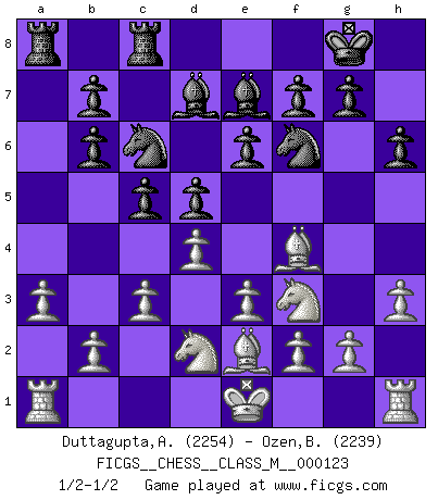 Last move : 1/2-1/2 2023 July 21 18:35:33 [Event "FICGS__CHESS__CLASS_M__000123"] [Site "FICGS"] [Date "2023.06.04"] [Round "1"] [White "Duttagupta,Aniruddha"] [Black "Ozen,Bahadir"] [Result "1/2-1/2"] [WhiteElo "2254"] [BlackElo "2239"] 1.d4 Nf6 2.Bf4 d5 3.e3 c5 4.c3 Nc6 5.Nd2 Bf5 6.Ngf3 Qb6 7.Nh4 Bd7 8.Qb3 e6 9.Be2 Be7 10.h3 O-O 11.Nhf3 Rfc8 12.Qxb6 axb6 13.a3 h6 1/2-1/2 Follow this game move after move (download)Winning isn't everything... but losing is nothing. (Mednis) Obendrein hat der FIDE-Präsident den Revolutionsführer Gaddafi zum »Großmeister« ernannt, am Ende der WM. Das ist lächerlich! (Joel Lautier) Botvinnik trató de alejar el misterio referente al Ajedrez, siempre relacionandolo a situaciones de la vida diaria. Solía llamar al Ajedrez un problema inexacto típico, similar a aquellos en que la gente tiene siempre que resolver a cada día. (Garry Kasparov) Je ne crois pas en la psychologie, je crois aux bons coups. (Robert Fischer) All battles are fought by scared men who'd rather be someplace else. (John Wayne in the movie In harm's way)