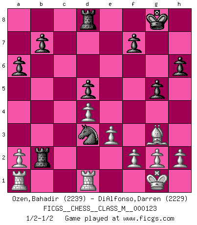 Last move : 1/2-1/2 2023 June 24 13:5:5 [Event "FICGS__CHESS__CLASS_M__000123"] [Site "FICGS"] [Date "2023.06.04"] [Round "1"] [White "Ozen,Bahadir"] [Black "DiAlfonso,Darren"] [Result "1/2-1/2"] [WhiteElo "2239"] [BlackElo "2229"] 1.d4 Nf6 2.c4 e6 3.Nf3 d5 4.Nc3 Bb4 5.cxd5 exd5 6.Bg5 h6 7.Bh4 O-O 8.e3 Bf5 9.Qb3 Bxc3+ 10.Qxc3 g5 11.Bg3 Ne4 12.Qxc7 Nc6 13.Qxd8 Rfxd8 14.Bb5 Rac8 15.Nd2 Nb4 16.Nxe4 Bxe4 17.O-O a6 18.Ba4 Bc2 19.Bxc2 Rxc2 20.Rfd1 Rxb2 21.Rab1 Nd3 22.Ra1 1/2-1/2 Follow this game move after move (download)Later, I began to succeed in decisive games. Perhaps because I realized a very simple truth: not only was I worried, but also my opponent. (Mikhail Tal) Über die Verhaftung Bobby Fischers: Warum es die Bush-Administration für nötig befindet einen 61 Jahre alten Mann zu hetzten, der für niemanden ausser sich selbste eine Gefahr darstellt ist ein Rätsel. (Nigel Short) El Ajedrez es en su esencia, un juego. En su forma, un arte. Y en su ejecución, una ciencia. (Baron Tassilo) Si rien de grave n'est détecté lors de l'analyse d'une position, on joue alors le coup. Seconde règle de Blumenfeld. There are three kinds of lies: lies, damned lies and statistics. (Mark Twain)
