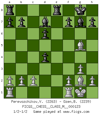 Last move : 1/2-1/2 2023 July 3 18:56:48 [Event "FICGS__CHESS__CLASS_M__000123"] [Site "FICGS"] [Date "2023.06.04"] [Round "1"] [White "Perevozchikov,Vjacheslav"] [Black "Ozen,Bahadir"] [Result "1/2-1/2"] [WhiteElo "2263"] [BlackElo "2239"] 1.Nf3 d5 2.g3 g6 3.Bg2 Bg7 4.O-O e5 5.d3 Nc6 6.e4 Nge7 7.Nc3 dxe4 8.dxe4 O-O 9.Nd5 Nxd5 10.exd5 Nd4 11.Nxd4 exd4 12.Bf4 Re8 13.Qd3 Bf5 14.Qb5 g5 15.d6 Qd7 16.Qxd7 Bxd7 17.Bxg5 cxd6 1/2-1/2 Follow this game move after move (download)Who is your opponent tonight, tonight I am playing against the Black pieces. (Akiba Rubinstein) Bogoljubow: Matt in vier Zügen! Tartakower: Ich verbitte mir jede Belästigung! (Savielly Grigorievitsch Tartakower) La caracteristica mas importante en la posición del Ajedrez es la actividad de las piezas. Esto es absolutamente fundamental en todas las fases del juego: Apertura, Juego Medio y especialmente Finales. La limitación primordial en la actividad de una pieza, es la estructuración de los Peones. (Michael Stean) On croit qu'il y a plus de mauvais joueurs que de bons joueurs, c'est faux : Il y a autant de joueurs qui gagnent que de joueurs qui perdent. (Philippe Geluck) Now the reason the enlightened prince and the wise general conquer the enemy whenever they move and their achievements surpass those of ordinary men is foreknowledge. (Sun Tzu)