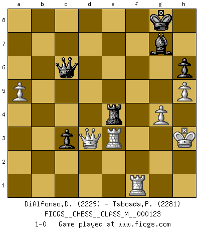 Last move : 1-0 2024 February 13 4:40:1 [Event "FICGS__CHESS__CLASS_M__000123"] [Site "FICGS"] [Date "2023.06.04"] [Round "1"] [White "DiAlfonso,Darren"] [Black "Taboada,Pedro Pablo"] [Result "1-0"] [WhiteElo "2229"] [BlackElo "2281"] 1.d4 Nf6 2.c4 e6 3.Nf3 c5 4.d5 exd5 5.cxd5 d6 6.Nc3 g6 7.Nd2 Bg7 8.e4 O-O 9.Be2 Re8 10.O-O Na6 11.f3 Nc7 12.a4 b6 13.Kh1 Rb8 14.Nc4 Ba6 15.Bg5 h6 16.Bh4 Qd7 17.Ne3 Bxe2 18.Qxe2 a6 19.Qc2 b5 20.a5 Rec8 21.h3 Nh5 22.Ne2 Ne8 23.Rad1 Nef6 24.g4 Nh7 25.Be1 N5f6 26.Ng3 Re8 27.Rd2 Qd8 28.h4 Nd7 29.Rh2 Ne5 30.h5 Nf6 31.Qe2 c4 32.Bc3 g5 33.Ngf5 Bf8 34.Nc2 Nfd7 35.f4 gxf4 36.Rxf4 Rb7 37.Nb4 f6 38.Nc6 Qc8 39.Nxe5 Nxe5 40.Qd2 Kh7 41.Rg2 Rf7 42.Rf1 Qb7 43.Bb4 Qd7 44.Rg3 Rd8 45.Kg2 Qe8 46.Nd4 Qd7 47.Ne6 Re8 48.Qf2 Kg8 49.Bc3 Rxe6 50.dxe6 Qxe6 51.Qf5 Qe8 52.b3 Rg7 53.bxc4 bxc4 54.Bxe5 Rg5 55.Qxf6 Bg7 56.Qxd6 Rxe5 57.Qxa6 Rxe4 58.Kh3 c3 59.Qd3 Qc6 60.Re3 1-0 Follow this game move after move (download)Bobby just drops the pieces and they fall on the right squares. (Miguel Najdorf) Ivan Sokolov treibt mich als Beifahrer an mit go Loeky go - . (Loek van Wely) Los problemas de Ajedrez exigen del compositor las mismas virtudes que caracterizan todo el arte de valor: originalidad, invención, concisión, armonía, complejidad e insinceridad explendida. (Vladimir Nabokov) Soyez une menace à chaque fois que vous vous asseyez pour jouer. (Ken Smith) Chess is everything: art, science and sport. (Anatoly Karpov)