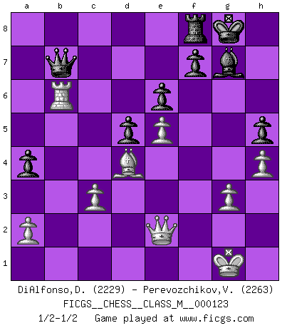 Last move : 1/2-1/2 2023 July 9 21:37:1 [Event "FICGS__CHESS__CLASS_M__000123"] [Site "FICGS"] [Date "2023.06.04"] [Round "1"] [White "DiAlfonso,Darren"] [Black "Perevozchikov,Vjacheslav"] [Result "1/2-1/2"] [WhiteElo "2229"] [BlackElo "2263"] 1.d4 e6 2.e4 d5 3.Nc3 Nf6 4.e5 Nfd7 5.f4 c5 6.Nf3 Nc6 7.Be3 cxd4 8.Nxd4 Qb6 9.Qd2 Qxb2 10.Rb1 Qa3 11.Bb5 Nxd4 12.Bxd4 a6 13.Bxd7+ Bxd7 14.Rb3 Qe7 15.Rxb7 Rc8 16.O-O Qd8 17.Qe3 Rc4 18.Rfb1 Be7 19.f5 Bg5 20.Qd3 O-O 21.f6 Bc6 22.Re7 h6 23.g3 h5 24.h4 Bh6 25.Rb6 Qc8 26.fxg7 Bxg7 27.Ra7 Bb5 28.Nxb5 axb5 29.c3 Ra4 30.Rxa4 bxa4 31.Qe2 Qc7 32.Ra6 Qb7 33.Rb6 1/2-1/2 Follow this game move after move (download)The King is a fighting piece. Use it ! (Wilhelm Steinitz) Kombinieren und Schwarzhandel gehören verboten. (Savielly Grigorievitsch Tartakower) El tablero es el mundo, las piezas es el fenomeno del universo, las reglas del juego son lo que llamamos leyes de la naturaleza y el jugador del lado opuesto, se encuentra oculto a nuestra vista. (Thomas Huxley) Dieu déplace le joueur, et celui-ci la pièce. Quel Dieu derrière Dieu commence donc la trame ? Arturo Perez-Reverte (prix de littérature policière 1993). Thus, what is of supreme importance in war is to attack the enemy's strategy. (Sun Tzu)