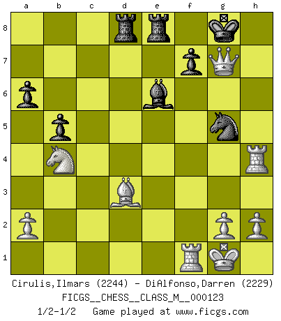 Last move : 1/2-1/2 2023 June 15 22:52:25 [Event "FICGS__CHESS__CLASS_M__000123"] [Site "FICGS"] [Date "2023.06.04"] [Round "1"] [White "Cirulis,Ilmars"] [Black "DiAlfonso,Darren"] [Result "1/2-1/2"] [WhiteElo "2244"] [BlackElo "2229"] 1.c3 Nf6 2.Nf3 d5 3.d4 e6 4.Bf4 Bd6 5.e3 O-O 6.Bd3 c5 7.dxc5 Bxc5 8.Nbd2 Nc6 9.O-O Re8 10.e4 e5 11.Bg5 d4 12.cxd4 Bxd4 13.Nxd4 Nxd4 14.Nc4 b5 15.Ne3 h6 16.Bh4 a6 17.f4 exf4 18.Rxf4 g5 19.e5 gxh4 20.Rxd4 Qe7 21.Qf3 Qxe5 22.Nc2 Be6 23.Rf1 Nh7 24.Rxh4 Rad8 25.Nb4 Ng5 26.Qh5 Qxb2 27.Qxh6 Qg7 28.Qxg7+ 1/2-1/2 Follow this game move after move (download)The enormous mental resilience, without which no Chess player can exist, was so much taken up by Chess that he could never free his mind of this game. (Albert Einstein) Dieses schreckliche Gefühl, dass ich gegen eine Maschine spielte, die niemals Fehler macht, zerschmetterte meinen Widerstand. (Mark Taimanov) El ganar no lo es todo... pero el perder es nada. (Mednis) Le thème de l'attaque double intervient d'une manière ou d'une autre dans l'immense majorité des combinaisons. (Youri Averbakh) Macintosh - we might not get everything right, but at least we knew the century was going to end. (Douglas Adams)