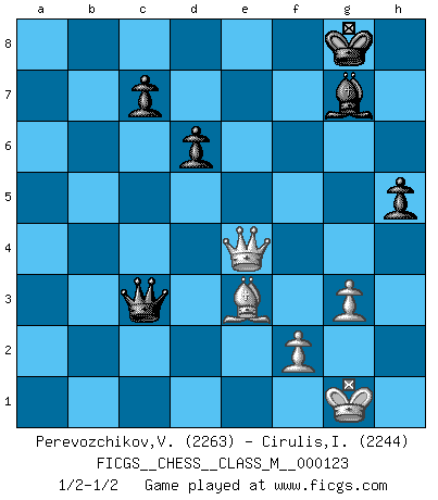 Last move : 1/2-1/2 2023 August 27 18:15:50 [Event "FICGS__CHESS__CLASS_M__000123"] [Site "FICGS"] [Date "2023.06.04"] [Round "1"] [White "Perevozchikov,Vjacheslav"] [Black "Cirulis,Ilmars"] [Result "1/2-1/2"] [WhiteElo "2263"] [BlackElo "2244"] 1.Nf3 f5 2.g3 Nf6 3.Bg2 g6 4.O-O Bg7 5.d4 O-O 6.c4 d6 7.Nc3 Qe8 8.Re1 Qf7 9.a4 Qxc4 10.a5 Na6 11.Ra4 Qf7 12.Ng5 Qe8 13.Bxb7 Bxb7 14.Qb3+ Bd5 15.Nxd5 Kh8 16.Nf4 Rb8 17.Qd1 Qd7 18.e4 fxe4 19.Nxe4 Nh5 20.Ng5 Nxf4 21.Bxf4 Rf6 22.d5 Nc5 23.Rc4 Rxb2 24.Be3 Qb5 25.Rh4 Nd3 26.Nxh7 Rb4 27.Rxb4 Qxb4 28.Nxf6 Nxe1 29.Ne4 Qxe4 30.Qxe1 a6 31.Qf1 Qxd5 32.Qxa6 Kh7 33.h4 Bc3 34.Qc8 Qxa5 35.Qf8 Bg7 36.Qxe7 Qc3 37.h5 gxh5 38.Qe4+ Kg8 1/2-1/2 Follow this game move after move (download)In blitz, the Knight is stronger than the Bishop. (Vlastimil Hort) Ich spiele ehrlich und spiele, um zu gewinnen. Wenn ich verliere nehme ich meine Medizin. (Robert James Fischer) Un Peón pasado es un criminal, quién debe ser mantenido bajo candado y llave. Leves medidas, tales como vigilancia policiaca, no son suficientes. (Aaron Nimzovich) Des idées, des idées, j'en ai cent, j'en ai mille. Des bonnes, des mauvaises, applicables, irréalisables... Il suffit de faire le tri ! (Roos) Knowledge will give you power, but character respect. (Bruce Lee)