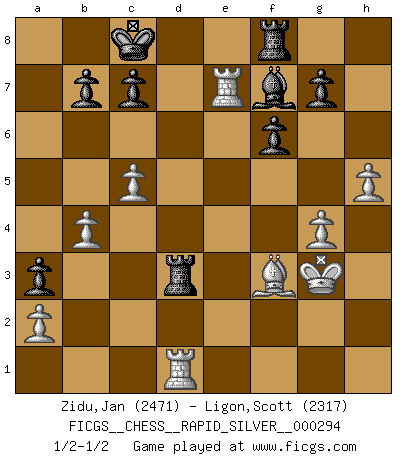Last move : 1/2-1/2 2023 August 3 3:14:29 [Event "FICGS__CHESS__RAPID_SILVER__000294"] [Site "FICGS"] [Date "2023.06.11"] [Round "1"] [White "Zidu,Jan"] [Black "Ligon,Scott"] [Result "1/2-1/2"] [WhiteElo "2471"] [BlackElo "2317"] 1.d4 d5 2.c4 e5 3.dxe5 d4 4.Nf3 Nc6 5.Nbd2 Nge7 6.Nb3 Ng6 7.Nfxd4 Ngxe5 8.e3 a5 9.Be2 a4 10.Nxc6 Qxd1+ 11.Kxd1 Nxc6 12.Nd4 Bd7 13.Bd2 O-O-O 14.Ke1 Nxd4 15.exd4 a3 16.b3 Bf5 17.Bc3 Bd6 18.g4 Be4 19.f3 Bg6 20.h4 Bg3+ 21.Kf1 h5 22.Kg2 Bf4 23.Rae1 f6 24.c5 hxg4 25.fxg4 Be3 26.Bf3 Bxd4 27.Bxd4 Rxd4 28.h5 Bf7 29.Re7 Rd2+ 30.Kg3 Rf8 31.b4 Rd3 32.Rd1 1/2-1/2 Follow this game move after move (download)Modern Chess is too much concerned with things like Pawn structure. Forget it, Checkmate ends the game. (Nigel Short) Ein bischen Romantik kann weder im Schach noch in der Liebe schaden. Also versuche ich mich ab und zu daran zu erinnern. (Nigel Short) Botvinnik trataba de restarle el misterio al Ajedrez, siempre relacionandolo a situaciones de la vida ordinaria. El gustaba de llamar al Ajedrez un típico problema inexacto similar a aquellos de los cuales la gente siempre tiene que enfrentarse en la vida cotidiana. (Garry Kasparov) Les Echecs, c'est l'art de la guerre sans les charniers, c'est la résurrection des morts tombés au champ d'honneur, l'espoir perpétuel, la suprématie de l'intelligence sur la force, la culture de l'esprit. (F. Szpiner) Man with more than one clock never knows what time it is. (Chinese thought)