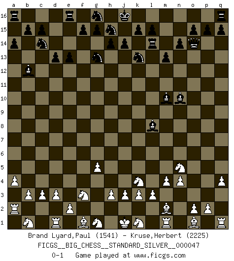 Last move : 0-1 2023 June 17 16:20:38 [Event "FICGS__BIG_CHESS__STANDARD_SILVER__000047"] [Site "FICGS"] [Date "2023.06.13"] [Round "1"] [White "Brand Lyard,Paul"] [Black "Kruse,Herbert"] [Result "0-1"] [WhiteElo "1541"] [BlackElo "2225"] 1.j2-k4 m15-m13 2.m2-m4 j15-k13 3.d2-d3 h16-o10 4.p1-o3 o10-f2 5.e1-d1 f2-b6 6.b2-b3 b6-f6 7.c2-c3 p16-o14 8.n2-n3 l16-p12 9.h2-f3 h15-g13 10.h1-l4 k16-h15 11.a2-a4 n15-n14 12.k2-k3 e15-e13 13.c1-p13 b16-c14 14.q2-q4 d15-d13 15.p13-o14 f6-o14 16.a1-a2 c16-l8 17.o3-n5 f16-b12 18.l2-l3 o16-f8 19.l1-m2 m16-m14 20.g2-g4 a15-a14 21.n3-n4 m14-l14 22.l4-p8 p12-n10 23.p8-m8 f8-j5 24.m8-m10 j5-h6 25.g4-g5 h6-m10 0-1 Follow this game move after move (download)I like to say that Bobby Fischer was the greatest player ever. But what made Fischer a genius was his ability to blend an American freshness and pragmatism with Russian ideas about strategy. (Bruce Pandolfini) Der beste Spieler in einem Turnier gewinnt es nie. Er landet auf Platz zwei oder drei. (Siegbert Tarrasch) El Ajedrez es un invernadero donde los frutos del carácter pueden madurar mas completamente que en la vida. (Edward Morgan Foster) Même si vous avez un bon coup à faire, regardez toujours s'il n'y en a pas un qui lui soit préférable. (Pedro Damiano) God is an atheist. (Unknown)