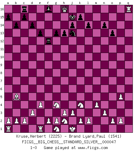 Last move : 1-0 2023 June 19 16:21:11 [Event "FICGS__BIG_CHESS__STANDARD_SILVER__000047"] [Site "FICGS"] [Date "2023.06.13"] [Round "2"] [White "Kruse,Herbert"] [Black "Brand Lyard,Paul"] [Result "1-0"] [WhiteElo "2225"] [BlackElo "1541"] 1.m2-m4 n15-n14 2.j2-k4 d15-d14 3.h1-o7 g15-g14 4.b1-c3 o15-o13 5.e2-e4 e15-e13 6.p1-o3 e16-e14 7.f1-b5 l15-l14 8.d2-d3 e14-f14 9.h2-g4 b16-c14 10.l1-p5 g14-g13 11.k1-h2 h15-j13 12.n2-n3 k16-h15 13.o1-c12 c16-e14 14.c12-e14 f14-e14 15.o7-f15 e14-e15 16.f15-b11 b15-b14 17.b11-d13 o16-b4 18.d13-c14 a16-c16 19.c14-c4 b4-c3 20.c4-c3 m15-m13 21.c3-p15 p16-q14 22.c1-q14 q16-p16 23.p15-h8 p16-p5 24.o3-p5 m16-p16 25.q2-q4 p16-p5 26.q4-p5 j15-k13 27.q14-k8 l16-m15 28.q1-q15 j16-j15 29.q15-m15 h16-l16 30.m15-q15 l16-p16 31.k8-n11 m13-m12 32.n11-m12 j15-j16 33.q15-q16 p16-q16 34.m12-q16 h14-h13 35.m1-q1 e15-f15 36.q16-m12 k13-m12 37.h8-m12 f15-f4 38.q1-q16 h15-k16 39.m12-o12 f4-f12 40.o12-k16 j16-h15 41.k16-g16 h15-j15 42.g16-h16 1-0 Follow this game move after move (download)All that matters on the Chessboard is good moves. (Bobby Fischer) Wer nie einen Fehler gemacht hat, hat nie etwas Neues ausprobiert. (Albert Einstein) El Ajedrez es un mar en el cual un mosquito puede beber y un elefante puede bañarse. (Refrán Hindú) Il n'y a pas eu de défaite parce que je ne crois pas que cet ordinateur ait jamais existé. IBM a triché en refusant d'imprimer les modes de recherche de la machine. C'est évident, pendant le match, des coups décisifs ont été joués par des êtres humains. Aujourd'hui, les meilleurs spécialistes en informatique ne peuvent toujours pas expliquer comment Deep-Blue a pu jouer contre la logique des ordinateurs. IBM a gagné une guerre de communication, mais ils sont incapables de prouver que l'ordinateur a gagné tout seul. (Garry Kasparov) Games, world of games... There's always an opponent, and there's always a victim. (Revolver, movie)