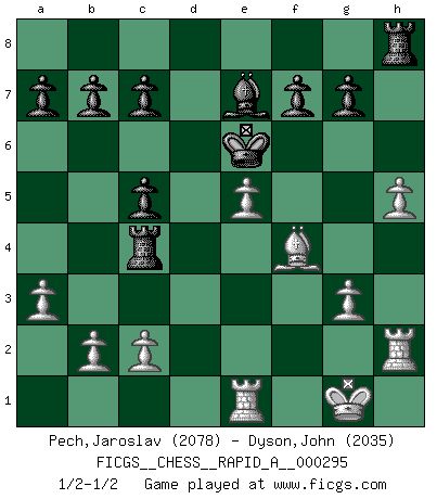 Last move : 1/2-1/2 2023 August 26 15:53:48 [Event "FICGS__CHESS__RAPID_A__000295"] [Site "FICGS"] [Date "2023.06.14"] [Round "1"] [White "Pech,Jaroslav"] [Black "Dyson,John"] [Result "1/2-1/2"] [WhiteElo "2078"] [BlackElo "2035"] 1.e4 e5 2.Nf3 Nc6 3.Bb5 Nf6 4.O-O Nxe4 5.d4 Nd6 6.Bxc6 dxc6 7.dxe5 Nf5 8.Qxd8+ Kxd8 9.Rd1+ Ke8 10.Nc3 Ne7 11.h3 Ng6 12.Be3 Be7 13.Ne2 h5 14.Rd2 h4 15.Nf4 Nxf4 16.Bxf4 c5 17.Re1 Be6 18.Ng5 Rh6 19.Nxe6 Rxe6 20.Rde2 Ra6 21.a3 Kd7 22.g4 hxg3 23.fxg3 Ke6 24.h4 Ra4 25.h5 Rh8 26.Rh2 Rc4 1/2-1/2 Follow this game move after move (download)Everything is in a state of flux, and this includes the world of Chess. (Mikhail Botvinnik) Rauchen ist dem Schachspieler bei seiner Arbeit, also im Wettkampf, untersagt. (Viktor Kortschnoi) Fischer es una tragedia del Ajedrez Americano a la par con Morphy y Pillsbury. (Mig Greengard) Seul un grand joueur sait à quel point il joue faiblement. (Xavier Tartacover) First of all, we have to go back to the classical time control. (Anatoly Karpov)