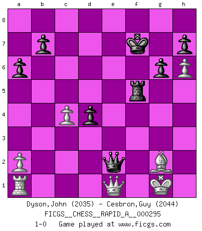 Last move : 1-0 2023 August 27 2:23:47 [Event "FICGS__CHESS__RAPID_A__000295"] [Site "FICGS"] [Date "2023.06.14"] [Round "1"] [White "Dyson,John"] [Black "Cesbron,Guy"] [Result "1-0"] [WhiteElo "2035"] [BlackElo "2044"] 1.e4 e6 2.d4 d5 3.Nc3 Nf6 4.e5 Nfd7 5.f4 c5 6.Nf3 Nc6 7.Be3 a6 8.Ne2 Qb6 9.Qc1 Be7 10.h4 O-O 11.c3 f6 12.h5 Qc7 13.Kf2 fxe5 14.fxe5 Ndxe5 15.dxe5 Nxe5 16.Kg1 Ng4 17.h6 Rf7 18.Bg5 Bd6 19.Rh4 e5 20.Nh2 Nxh2 21.Rxh2 g6 22.c4 d4 23.Rh4 e4 24.Rxe4 Bf5 25.Rh4 Qd7 26.Qd2 Bg4 27.Nf4 Raf8 28.Nd5 Bg3 29.Bd3 Bf2+ 30.Kh1 Bxh4 31.Bxh4 Bf3 32.Nf6+ Rxf6 33.Bxf6 Rxf6 34.gxf3 Rxf3 35.Bf1 Qg4 36.Bg2 Rf5 37.Kg1 Kf7 38.b4 cxb4 39.Qxb4 Qe2 40.Qe1 1-0 Follow this game move after move (download)Only the player with the initiative has the right to attack. (Wilhelm Steinitz) Wie gewinnt Tal? Er entwickelt alle seine Figuren in die Brettmitte und opfert sie dann irgendwo. (Robert James Fischer) En el Ajedrez, tal como es jugado por los Maestros, practicamente la suerte es eliminada. (Emanuel Lasker) Celui qui prend des risques peut perdre, celui qui n'en prend pas perd toujours. (Xavier Tartacover) A good aphorism is too hard for the tooth of time, and is not worn away with the centuries, although it serves as food for every speech. (Friedrich Nietzsche)
