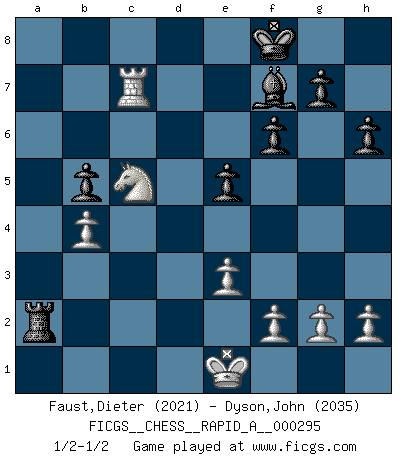 Last move : 1/2-1/2 2023 July 16 13:56:51 [Event "FICGS__CHESS__RAPID_A__000295"] [Site "FICGS"] [Date "2023.06.14"] [Round "1"] [White "Faust,Dieter"] [Black "Dyson,John"] [Result "1/2-1/2"] [WhiteElo "2021"] [BlackElo "2035"] 1.d4 Nf6 2.c4 e6 3.Nf3 d5 4.Nc3 Bb4 5.Bg5 h6 6.Bxf6 Qxf6 7.e3 O-O 8.Rc1 dxc4 9.Bxc4 c5 10.dxc5 Nd7 11.O-O Nxc5 12.Be2 Rd8 13.Qc2 Bd7 14.a3 Bxc3 15.Qxc3 Qxc3 16.Rxc3 b6 17.b4 Ne4 18.Rc7 a5 19.Ne5 Be8 20.Bf3 Nd2 21.Bxa8 Nxf1 22.Kxf1 Rxa8 23.Ke2 axb4 24.axb4 Ra2+ 25.Ke1 Kf8 26.Rb7 b5 27.Rc7 f6 28.Nd3 e5 29.Nc5 Bf7 30.Rc8+ Ke7 31.Rc7+ Kf8 32.Rc8+ Ke7 33.Rc7+ Kf8 1/2-1/2 Follow this game move after move (download)Chess is really ninety nine percent calculation. (Soltis) Im Schach gibt es keinen Platz für Galanterie. (Irving Chernev) Nunca nadie ha ganado una partida de Ajedrez rindiendose. (Unknown) Des idées, des idées, j'en ai cent, j'en ai mille. Des bonnes, des mauvaises, applicables, irréalisables... Il suffit de faire le tri ! (Roos) The right perception of any matter and a misunderstanding of the same matter do not wholly exclude each other. (Kafka's the trial)