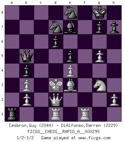 Last move : 1/2-1/2 2023 July 22 2:5:51 [Event "FICGS__CHESS__RAPID_A__000295"] [Site "FICGS"] [Date "2023.06.14"] [Round "1"] [White "Cesbron,Guy"] [Black "DiAlfonso,Darren"] [Result "1/2-1/2"] [WhiteElo "2044"] [BlackElo "2229"] 1.e4 c5 2.Nf3 d6 3.d4 cxd4 4.Nxd4 Nf6 5.Nc3 a6 6.Be3 e5 7.Nb3 Be6 8.f3 Be7 9.Qd2 O-O 10.O-O-O Nbd7 11.g4 b5 12.g5 b4 13.Ne2 Ne8 14.f4 a5 15.f5 a4 16.fxe6 axb3 17.exf7+ Rxf7 18.cxb3 Rxa2 19.Ng3 Rxf1 20.Rhxf1 Ra1+ 21.Kc2 Qc8+ 22.Kd3 Qa6+ 23.Kc2 Qc6+ 24.Kd3 Qb5+ 1/2-1/2 Follow this game move after move (download)There is no remorse like the remorse of Chess. (H. G. Wells) Spielt Blackmar-Diemer-Gambit, und das Matt kommt von selbst! (Emil Joseph Diemer) Yo considero que Fischer es uno de los expertos mas grandes de aperturas de siempre. (Keith Hayward) Toute estimation doit être constamment réévaluée. (Jacob Estrin) Wisdom doesn't necessarily come with age. Sometimes age just shows up all by itself. (Tom Wilson)