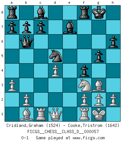 Last move : 0-1 2008 February 4 0:38:55 [Event "FICGS__CHESS__CLASS_D__000057"] [Site "FICGS"] [Date "2007.09.01"] [Round "1"] [White "Cridland,Graham"] [Black "Cooke,Tristrom"] [Result "0-1"] [WhiteElo "1524"] [BlackElo "1642"] 1.e4 e5 2.Nf3 Nc6 3.Bb5 Bc5 4.c3 Nge7 5.d4 exd4 6.cxd4 Bb4+ 7.Nc3 d5 8.exd5 Nxd5 9.O-O O-O 10.Bg5 Qd6 11.Rc1 h6 12.Bh4 Nce7 13.Ne4 Qg6 14.Bd3 Qb6 15.Bb1 g5 16.Bg3 f5 17.Nc3 f4 18.Nxd5 Nxd5 19.a3 Be7 0-1 This chess game has been lost on time (started : 2007.09.01 8:38:7) Ruy Lopez : Classical defense, 4.c3 Kingside Castling by player White (move 9) Kingside Castling by player Black (move 9) Player Black won this chess game. Follow this game move after move (download)When you are lonely, when you feel yourself an alien in the world, play Chess. This will raise your spirits and be your counselor in war. (Aristotle) Gegen einen Schachcomputer zu verlieren ist wie Löcher in den Strümpfen zuhaben. Es ist nicht peinlich, solange man der einzige ist der es weiß. (Anonymous) Diferente gente reacciona diferentemente en aceptar la derrota. (Bobby Fischer) Les erreurs sont comme les malheurs, elles n'arrivent jamais seules. (Siegbert Tarrasch) Computers have lots of memory but no imagination. (Anonymous)