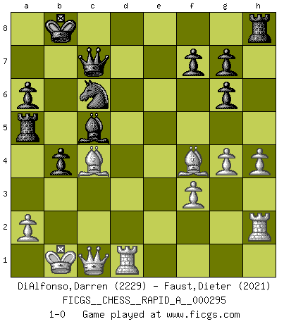 Last move : 1-0 2023 July 15 8:52:58 [Event "FICGS__CHESS__RAPID_A__000295"] [Site "FICGS"] [Date "2023.06.14"] [Round "1"] [White "DiAlfonso,Darren"] [Black "Faust,Dieter"] [Result "1-0"] [WhiteElo "2229"] [BlackElo "2021"] 1.d4 d5 2.c4 c6 3.Nf3 Nf6 4.e3 Bf5 5.Nc3 e6 6.Nh4 Be4 7.f3 Bg6 8.Qb3 Qc7 9.Bd2 Nbd7 10.O-O-O dxc4 11.Bxc4 b5 12.Be2 a6 13.Nxg6 hxg6 14.h4 c5 15.Kb1 c4 16.Qc2 Nb6 17.g4 Nbd5 18.Nxd5 Nxd5 19.e4 Nb4 20.Qc3 O-O-O 21.b3 Nc6 22.d5 exd5 23.exd5 Rxd5 24.bxc4 b4 25.Qc1 Ra5 26.c5 Rxc5 27.Bc4 Kb8 28.Be3 Ra5 29.Rh2 Bc5 30.Bf4 1-0 Follow this game move after move (download)It is difficult to play against Einstein's theory --on his first loss to Fischer. (Mikhail Tal) Wenn man heute mit 14 Jahren noch kein GM ist, kann man es vergessen. (Viswanathan Anand) No existe un remordimiento como el remordimiento del Ajedrez. (H. G. Wells) Les sacrifices démontrent seulement que quelqu'un a gaffé. (Savielly Tartacover) A good player is always lucky. (Capablanca)