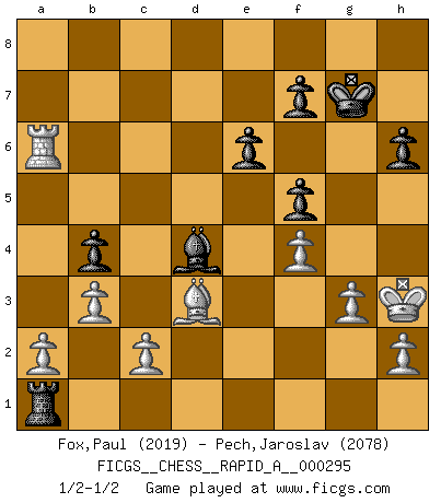 Last move : 1/2-1/2 2023 October 20 1:55:28 [Event "FICGS__CHESS__RAPID_A__000295"] [Site "FICGS"] [Date "2023.06.14"] [Round "1"] [White "Fox,Paul"] [Black "Pech,Jaroslav"] [Result "1/2-1/2"] [WhiteElo "2019"] [BlackElo "2078"] 1.e4 e6 2.d4 d5 3.Nc3 Nf6 4.Bg5 dxe4 5.Nxe4 Be7 6.Bxf6 gxf6 7.Nf3 f5 8.Nc3 a6 9.g3 b5 10.Bg2 Bb7 11.O-O O-O 12.Qe2 c5 13.dxc5 b4 14.Rfd1 Qc7 15.Na4 Nd7 16.Ne5 Nxe5 17.Bxb7 Rab8 18.Bxa6 Bf6 19.Rd6 Qa5 20.b3 Nf3+ 21.Qxf3 Bxa1 22.Qf4 Rfd8 23.Rc6 Rd1+ 24.Kg2 Qd8 25.Nb6 Bf6 26.Bd3 Rxb6 27.Rxb6 Qd5+ 28.Kh3 Rg1 29.Rb8+ Kg7 30.f3 Qxc5 31.Qd2 h6 32.Rb5 Qc3 33.Qxc3 Bxc3 34.Ra5 Ra1 35.f4 Bd4 36.Be2 Rc1 37.Bd3 Ra1 38.Ra6 1/2-1/2 Follow this game move after move (download)Chess teaches you to control the initial excitement you feel when you see something that looks good and it trains you to think objectively when you're in trouble. (Stanley Kubrick) Ich habe die Schachforschung dermaßen betrieben, dass sie auf eine wissenschaftliche Basis gestellt wurde. (Mikhail Moiseyevich Botvinik) El ganador de una partida es aquel jugador que hace el penúltimo error. (Savielly Tartakover) L'action d'une oeuvre littéraire se déroule sur un champ de bataille. Les masques et les types du drame moderne correspondent aux pièces du jeu d'échecs. L'intrigue correspond aux coups et aux gambits, c'est à dire aux techniques du jeu telles qu'utilisées et interprétées par les joueurs. Les tactiques et les péripéties [mouvements] correspondent aux coups exécutés par l'adversaire. (Viktor Shklovsky) Imagination is more important than knowledge. Knowledge is limited. Imagination encircles the world. (Albert Einstein)