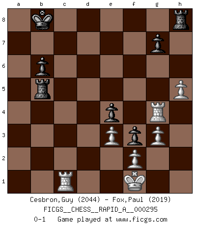 Last move : 0-1 2023 October 6 2:19:35 [Event "FICGS__CHESS__RAPID_A__000295"] [Site "FICGS"] [Date "2023.06.14"] [Round "1"] [White "Cesbron,Guy"] [Black "Fox,Paul"] [Result "0-1"] [WhiteElo "2044"] [BlackElo "2019"] 1.d4 d5 2.c4 c6 3.Nf3 Nf6 4.e3 Bf5 5.Nc3 e6 6.Nh4 Bg6 7.Nxg6 hxg6 8.Bd2 Nbd7 9.g3 Be7 10.b3 Bb4 11.Bg2 Bxc3 12.Bxc3 Ne4 13.Bxe4 dxe4 14.Qg4 Nf6 15.Qe2 g5 16.O-O Qe7 17.Kg2 O-O-O 18.b4 e5 19.h3 Qe6 20.Rh1 g4 21.h4 Qf5 22.Rhg1 Qf3+ 23.Kf1 Nd7 24.Ke1 f6 25.dxe5 Nxe5 26.Bxe5 fxe5 27.Qxf3 exf3 28.Rd1 Kc7 29.Rh1 c5 30.a3 b5 31.cxb5 c4 32.Rc1 Rd3 33.Rxc4+ Kb8 34.b6 axb6 35.Rc1 Rxa3 36.h5 Ra2 37.b5 Re2+ 38.Kf1 Rb2 39.Rh4 Rxb5 40.Rxg4 e4 0-1 Follow this game move after move (download)The passed Pawn is a criminal, who should be kept under lock and key. Mild measures, such as police surveillance, are not sufficient. (Aaron Nimzovich) Kleine Schachspieler machen Mist, und große Schachspieler machen Mist, aber große machen weniger Mist. (Fritz Sämisch) No soy una persona materialista y por eso, no resiento la falta o pérdida del dinero. La ausencia de cosas mundanas carece de importancia. Ya que el Ajedrez es una forma en la que puedo ser tan materialista como yo desee sin tener la necesidad de vender mi alma. (Jamie Walter Adams) Vous n'êtes pas toujours obligé de jouer le meilleur coup. Un coup doit être actif, entreprenant, correct et beau ! (David Bronstein) Who needs drugs and alcohol if he can play Big Chess at FICGS ? (Heinz-Georg Lehnhoff)