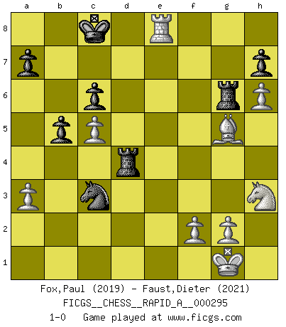 Last move : 1-0 2023 September 1 10:1:48 [Event "FICGS__CHESS__RAPID_A__000295"] [Site "FICGS"] [Date "2023.06.14"] [Round "1"] [White "Fox,Paul"] [Black "Faust,Dieter"] [Result "1-0"] [WhiteElo "2019"] [BlackElo "2021"] 1.e4 c6 2.d4 d5 3.Nc3 dxe4 4.Nxe4 Bf5 5.Ng3 Bg6 6.N1e2 e6 7.Nf4 Qc7 8.c3 Bd6 9.Qf3 Nf6 10.h4 Nbd7 11.h5 Bc2 12.h6 g6 13.Bd3 Bxd3 14.Nxd3 Qa5 15.O-O Qd5 16.Qe2 Rg8 17.Nf4 Qa5 18.c4 O-O-O 19.Nh3 g5 20.Bd2 Bb4 21.Be3 Bf8 22.b4 Bxb4 23.Rab1 Nb6 24.c5 Nbd5 25.Bxg5 Rd7 26.Qc2 Rg6 27.Rb3 Ng4 28.Rfb1 f6 29.Bc1 f5 30.Bg5 Qa4 31.a3 Ba5 32.Nxf5 exf5 33.Qxf5 b5 34.Qxg4 Bc3 35.Rxc3 Nxc3 36.Re1 Qxd4 37.Qxd4 Rxd4 38.Re8+ 1-0 Follow this game move after move (download)One doesn't have to play well, it's enough to play better than your opponent. (Siegbert Tarrasch) Vielleicht wirkt die Aura früherer Spieler glanzvoller als die der heutigen Spieler, aber das liegt daran, dass man kein Programm wie Fritz hatte, das einem all die Löcher in ihren Partien zeigt. (Vladimir Kramnik) Uno por uno, yo los acribillé, mi superioridad muy pronto se volvio aparente. (Jose Capablanca) Plusieurs personnes se sont demandées comment Tal faisait pour gagner... En fait, c'est très simple ! Il met ses pièces au centre de l'échiquier et les sacrifie quelque part ! (David Bronstein) If we knew what we were doing, we would not call it research. (Albert Einstein)