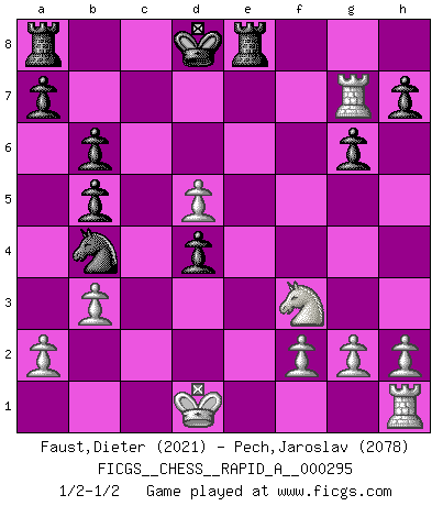 Last move : 1/2-1/2 2023 August 20 9:44:16 [Event "FICGS__CHESS__RAPID_A__000295"] [Site "FICGS"] [Date "2023.06.14"] [Round "1"] [White "Faust,Dieter"] [Black "Pech,Jaroslav"] [Result "1/2-1/2"] [WhiteElo "2021"] [BlackElo "2078"] 1.d4 Nf6 2.c4 g6 3.Nc3 d5 4.Nf3 Bg7 5.cxd5 Nxd5 6.Na4 Bf5 7.Nh4 Bd7 8.e4 e5 9.Nf3 exd4 10.exd5 Qe7+ 11.Be2 Qb4+ 12.Bd2 Qxa4 13.Qxa4 Bxa4 14.Rc1 c6 15.b3 Bb5 16.Bxb5 cxb5 17.Rc7 b6 18.Bb4 Na6 19.Re7+ Kd8 20.Rxf7 Re8+ 21.Kd1 Nxb4 22.Rxg7 Re7 23.Rg8+ Re8 24.Rg7 Re7 25.Rg8+ Re8 26.Rg7 1/2-1/2 Follow this game move after move (download)We must make sure that Chess will not be like a dead language, very interesting, but for a very small group. (Sytze Faber) Eine Person mit durchschnittlichem IQ kann etwa eine ELO von 2000 erreichen. (Jonathan Levitt) No es suficiente ser un buen jugador, se debe también de jugar bién. (Siegbert Tarrasch) Demandez au pauvre Cg1 ce qu'il en pense. Eduard Gufeld à propos de la variante Saemisch de l'Est-Indienne. Wisdom doesn't necessarily come with age. Sometimes age just shows up all by itself. (Tom Watson)