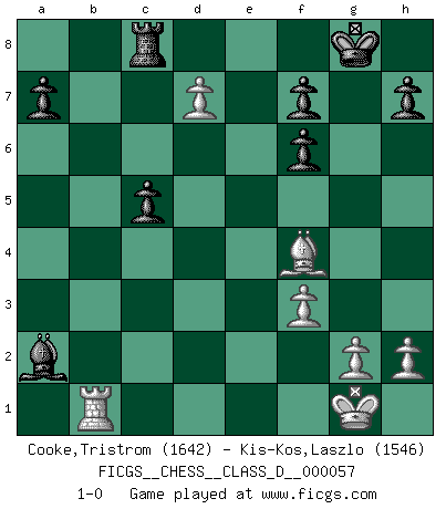 Last move : 1-0 2008 January 5 7:58:59 [Event "FICGS__CHESS__CLASS_D__000057"] [Site "FICGS"] [Date "2007.09.01"] [Round "1"] [White "Cooke,Tristrom"] [Black "Kis-Kos,Laszlo"] [Result "1-0"] [WhiteElo "1642"] [BlackElo "1546"] 1.e4 e5 2.Nf3 Nc6 3.Bc4 Nf6 4.d4 exd4 5.e5 d5 6.Bb5 Ne4 7.O-O Bg4 8.Qxd4 Bc5 9.Qd3 O-O 10.Bxc6 bxc6 11.Nc3 Bf5 12.Nd4 Bxd4 13.Qxd4 Qe7 14.Nxe4 Bxe4 15.Bf4 Rfb8 16.c4 c5 17.Qe3 Rxb2 18.f3 Bf5 19.cxd5 Qh4 20.d6 cxd6 21.exd6 Rc8 22.Qe5 Qf6 23.Qxf6 gxf6 24.Rfe1 Be6 25.Reb1 Rxa2 26.Rxa2 Bxa2 27.d7 1-0 Two knights defense Kingside Castling by player White (move 7) Kingside Castling by player Black (move 9) Player White won this chess game. Follow this game move after move (download)Chess is ruthless: you've got to be prepared to kill people. (Nigel Short) Spiel ein langweiliges Spiel zu Ende und lustige Dinge können passieren. (Hans Ree) Si yo gano un torneo, yo lo gano por mí mismo. Yo hago las jugadas. Nadie me ayuda. (Bobby Fischer) Vous m'avez demandé de vous exposer quel est le fondement de la prière. Je ne fais que préparer les pièces du jeu sur la table... Nous sera-t-il permis d'en adopter les règles et si nous les appliquons scrupuleusement nous ne tarderons pas à faire mat le Roi divin ! Il ne pourra échapper à nos mains. (Sainte Thérèse d'Avila, Chemin de perfection) Statistics can be made to prove anything - even the truth. (Author unknown)