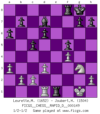 Last move : 1/2-1/2 2023 August 2 18:48:6 [Event "FICGS__CHESS__RAPID_D__000149"] [Site "FICGS"] [Date "2023.06.15"] [Round "1"] [White "Leurette,Marc-Antoine"] [Black "Joubert,Hennie"] [Result "1/2-1/2"] [WhiteElo "1652"] [BlackElo "1504"] 1.e4 c5 2.Nc3 Nc6 3.g3 e6 4.Bg2 d6 5.d3 Nf6 6.Nge2 Be7 7.Be3 O-O 8.Qd2 a6 9.a3 Bd7 10.O-O Rc8 11.Nf4 Ng4 12.Bf3 Nxe3 13.Qxe3 Bg5 14.Qe2 Nd4 15.Qd1 Bxf4 16.gxf4 Qh4 17.Bg2 Qxf4 18.Ne2 Nf3+ 19.Bxf3 Qxf3 20.Ng3 Qxd1 21.Raxd1 f5 22.exf5 exf5 23.Rfe1 Rce8 24.f4 Rxe1+ 1/2-1/2 Follow this game move after move (download)A thorough understanding of the typical mating continuations makes the most complicated sacrificial combinations leading up to them not only not difficult, but almost a matter of course. (Siegbert Tarrasch) Kombinieren und Schwarzhandel gehören verboten. (Savielly Grigorievitsch Tartakower) La estratégia requiere pensar, la táctica requiere observación. (Max Euwe) Dieu déplace le joueur, et celui-ci la pièce. Quel Dieu derrière Dieu commence donc la trame ? Arturo Perez-Reverte (prix de littérature policière 1993). Locking firmely the window serves nothing, only small thiefs pass through there, the big thiefs enter through the front door. (Luc-Olivier Leclerc)
