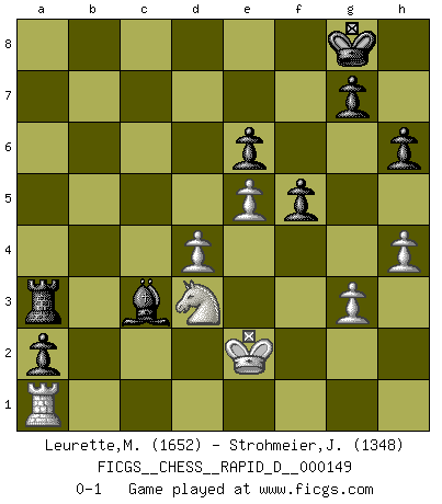 Last move : 0-1 2023 August 25 10:38:57 [Event "FICGS__CHESS__RAPID_D__000149"] [Site "FICGS"] [Date "2023.06.15"] [Round "1"] [White "Leurette,Marc-Antoine"] [Black "Strohmeier,Josef"] [Result "0-1"] [WhiteElo "1652"] [BlackElo "1348"] 1.e4 c5 2.Nc3 Nc6 3.g3 d6 4.Bg2 Bd7 5.d3 a6 6.Nf3 e6 7.O-O Be7 8.Be3 Nf6 9.a3 O-O 10.h3 Rb8 11.Rb1 b5 12.b4 cxb4 13.axb4 Qc7 14.Ne2 h6 15.Nd2 d5 16.d4 Nxb4 17.c3 Nc6 18.e5 Ne8 19.f4 a5 20.f5 exf5 21.Bxd5 Be6 22.Bxe6 fxe6 23.Nf4 Qd7 24.Qb3 Nc7 25.h4 b4 26.Nf3 bxc3 27.Qxc3 Rxb1 28.Rxb1 Nd5 29.Nxd5 Qxd5 30.Kf2 a4 31.Ra1 a3 32.Qc2 Ra8 33.Qa2 Qxa2+ 34.Rxa2 Nb4 35.Ra1 a2 36.Ne1 Nd5 37.Nd3 Ra3 38.Ke2 Nxe3 39.Kxe3 Bb4 40.Ke2 Bc3 0-1 Follow this game move after move (download)The Pawns are the soul of the game. (Francois Andre Danican Philidor) Lisa Lane, amerikanische Schachmeisterin, hatte Fischer einmal als stärksten lebenden Spieler bezeichnet. Antwort: Das ist richtig, aber Lisa Lane ist eigentlich nicht in der Lage, das zu beurteilen. (Robert James Fischer) Te sientas frente a un tablero y repentinamente tu corazón brinca. Tu mano tiembla al tomar una pieza y moverla. Pero lo que el Ajedrez te enseña es que tu debes permanecer ahí con calma y pensar de que si realmente es una buena idea o de que si hay otras ideas mejores. (Stanley Kubrick) L'ordinateur a tué l'originalité. Il n'y a plus guère d'aventures sur l'échiquier. (Jacob Murray) O divine art of subtlety and secrecy! Through you we learn to be invisible, through you inaudible and hence we can hold the enemy's fate in our hands. (Sun Tzu)