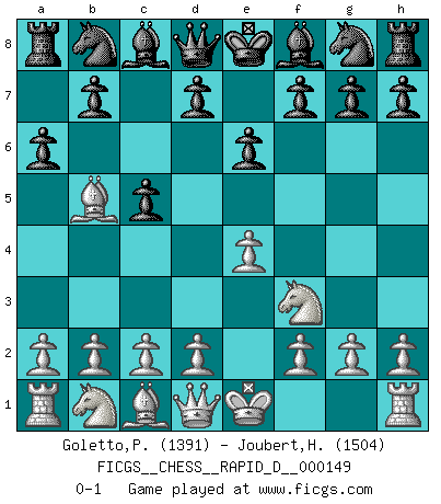 Last move : 0-1 2023 July 20 22:9:11 [Event "FICGS__CHESS__RAPID_D__000149"] [Site "FICGS"] [Date "2023.06.15"] [Round "1"] [White "Goletto,Piero Giuseppe"] [Black "Joubert,Hennie"] [Result "0-1"] [WhiteElo "1391"] [BlackElo "1504"] 1.e4 c5 2.Nf3 e6 3.Bb5 a6 0-1 This chess game has been lost on time (started : 2023.06.15 11:52:29) Follow this game move after move (download)In order to improve your game, you must study the endgame before everything else, for whereas the endings can be studied and mastered by themselves, the middle game and the opening must be studied in relation to the endgame. (Jose Raul Capablanca) Ohne Fehler kann es keine Brillanz geben. (Emanuel Lasker) Bobby es el jugador de Ajedrez mas fino que este país jamás haya producido. Su memoria para las movidas, su brillantez en soñar combinaciones y su feróz determinación por la victoria son algo extraño. (John Collins) Mais l'homme est une créature légère et illogique : semblable au joueur d'échecs, il n'aime que le processus du but à atteindre, non le but lui-même. (Dostoïevsky) A specialist learns more and more about less and less until he knows everything about nothing. (Nicholas Murray Butler)
