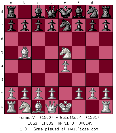 Last move : 1-0 2023 July 20 8:56:56 [Event "FICGS__CHESS__RAPID_D__000149"] [Site "FICGS"] [Date "2023.06.15"] [Round "1"] [White "Forme,Vocihc"] [Black "Goletto,Piero Giuseppe"] [Result "1-0"] [WhiteElo "1500"] [BlackElo "1391"] 1.e4 e5 2.Nf3 Nc6 3.Bb5 Nce7 4.Nxe5 1-0 This chess game has been lost on time (started : 2023.06.15 11:52:29) Follow this game move after move (download)When you don't know what to do, wait for your opponent to get an idea - it's sure to be wrong. (Tarrasch) Ich habe kein Problem mit Frauen, sondern nur mit dem Niveau ihres Schachspiels (Judith Polgar) Si el ingenio solamente fuese necesario para lucirse, las mujeres serían las mejores jugadoras de Ajedrez del mundo. (Albin) La victoire dans une partie d'Echecs appartient la plupart du temps à celui qui voit un peu plus loin que l'adversaire. (Lasker) Go and wake up your luck. (Persian saying)