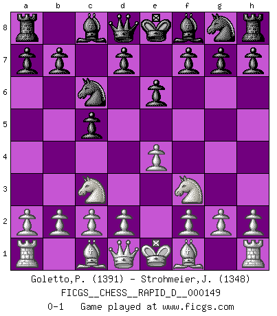 Last move : 0-1 2023 July 20 22:9:11 [Event "FICGS__CHESS__RAPID_D__000149"] [Site "FICGS"] [Date "2023.06.15"] [Round "1"] [White "Goletto,Piero Giuseppe"] [Black "Strohmeier,Josef"] [Result "0-1"] [WhiteElo "1391"] [BlackElo "1348"] 1.e4 c5 2.Nf3 Nc6 3.Nc3 e6 0-1 This chess game has been lost on time (started : 2023.06.15 11:52:29) Follow this game move after move (download)I guess a certain amount of temperament is expected of Chess geniuses. (Ron Gross) Wie gewinnt Tal? Er entwickelt alle seine Figuren in die Brettmitte und opfert sie dann irgendwo. (Robert James Fischer) No volvere nunca a jugar contigo. Has insultado a mi amigo. - cuando un oponente se maldijo por una mala jugada (Miguel Najdorf) Je menace de comprendre la position. (Anonyme) Do you know these so called Volunteers don't even get paid! (Simpsons)