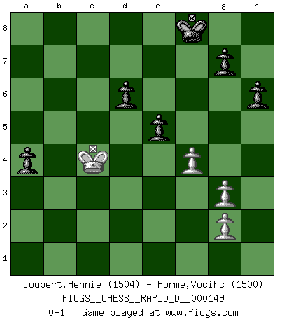 Last move : 0-1 2023 October 11 0:34:33 [Event "FICGS__CHESS__RAPID_D__000149"] [Site "FICGS"] [Date "2023.06.15"] [Round "1"] [White "Joubert,Hennie"] [Black "Forme,Vocihc"] [Result "0-1"] [WhiteElo "1504"] [BlackElo "1500"] 1.e4 c5 2.Nf3 e6 3.d4 cxd4 4.c3 dxc3 5.Nxc3 Nc6 6.Be2 d6 7.O-O Nf6 8.Bg5 Be7 9.Qd2 h6 10.Bh4 O-O 11.Rfd1 Qb6 12.Rac1 Rd8 13.Bg3 Nh5 14.b3 Nxg3 15.hxg3 Bd7 16.Na4 Qa5 17.Qxa5 Nxa5 18.Rc7 Rac8 19.Rdc1 Bf6 20.Rxc8 Rxc8 21.Rxc8+ Bxc8 22.Kf1 Nc6 23.Ke1 Nb4 24.a3 Nc2+ 25.Kd2 Nxa3 26.Bd3 Bd7 27.Nc3 Kf8 28.Ne1 Bd4 29.f4 a6 30.Nc2 Nxc2 31.Kxc2 Bxc3 32.Kxc3 a5 33.Bc4 Bc6 34.Bd3 f5 35.Kd4 fxe4 36.Bxe4 Bxe4 37.Kxe4 b5 38.Kd4 a4 39.bxa4 bxa4 40.Kc4 e5 0-1 Follow this game move after move (download)Adequate compensation for a sacrifice is having a sound combination leading to a winning position; adequate compensation for a blunder is having your opponent snatch defeat from the jaws of victory. (Bruce A. Moon) Der Umstand, daß uns eine 7 Stunden Zeitkontrolle ermöglicht eine großartige, tiefe Partie zu spielen, ist für die Massenmedien nicht weiter von Bedeutung. (Alexej Shirov) Hay jugadores fuertes y personas amables y yo soy un jugador fuerte. (Bobby Fischer) Le jeu d'échecs est comme rejeté hors du temps. (Antoine de Saint-Exupéry) Happy endings are just stories that haven't finished yet. (Jane Smith in Mr & Mrs Smith)
