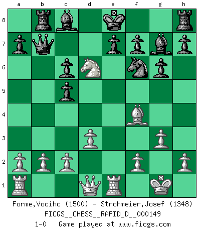 Last move : 1-0 2023 July 19 21:11:21 [Event "FICGS__CHESS__RAPID_D__000149"] [Site "FICGS"] [Date "2023.06.15"] [Round "1"] [White "Forme,Vocihc"] [Black "Strohmeier,Josef"] [Result "1-0"] [WhiteElo "1500"] [BlackElo "1348"] 1.e4 c5 2.Nf3 Nc6 3.Bb5 g6 4.Bxc6 bxc6 5.O-O Bg7 6.Re1 d6 7.e5 dxe5 8.Nxe5 Qc7 9.d3 Bxe5 10.g3 Rb8 11.Nd2 Bg7 12.Nc4 Nf6 13.Bf4 Qb7 14.Nd6+ 1-0 Follow this game move after move (download)Chess is a cold bath for the mind. (Sir John Simon) Mein Name ist Rustam Kamsky. Sie haben meinen Sohn belästigt. Bereiten Sie sich aufs Sterben vor. (Rustam Kamsky) El Ajedrez es un juego terrible. Si no dominas el centro, tu oponente tiene una posición mas libre. Si tu tienes el centro, entonces realmente tienes algo de que preocuparte. (Siegbert Tarrasch) Les écrivains ont utilisé les échecs pour analyser les côtés extrêmes de la nature humaine. Dans ce cadre, les échecs offrent un champ d'expérimentation idéal. Mais on pourrait faire la même chose avec la peinture. Et là, en vous référant à Van Gogh, vous ne tirerez pas de conclusion définitive sur les peintres. (Gary Kasparov) A shortcut is the longest distance between two points. (Don Groves)