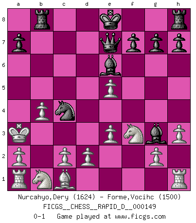 Last move : 0-1 2023 July 30 2:14:0 [Event "FICGS__CHESS__RAPID_D__000149"] [Site "FICGS"] [Date "2023.06.15"] [Round "1"] [White "Nurcahyo,Dery"] [Black "Forme,Vocihc"] [Result "0-1"] [WhiteElo "1624"] [BlackElo "1500"] 1.f4 d5 2.e3 Nf6 3.h3 e5 4.fxe5 Ne4 5.Nf3 Be7 6.Rg1 Bh4+ 7.Ke2 Ng3+ 8.Kd3 Bf5+ 9.Kc3 Ne4+ 10.Kb3 Bf2 11.Rh1 Bg3 12.Qe2 c5 13.Qb5+ Bd7 14.Qxb7 c4+ 15.Bxc4 dxc4+ 16.Kxc4 Be6+ 17.Kb4 Na6+ 18.Qxa6 Rb8+ 19.Ka3 Qe7+ 20.Qd6 Nxd6 21.b4 Nc4+ 0-1 Follow this game move after move (download)It is peculiar but a fact nevertheless, that gamblers in chess always have enthusiastic followers. (Botvinnik) Es ist nicht das erste mal, dass sich die FIDE dem Arabischen Geld gebeugt hat (über die FIDE WM 2004 in Lybien). (Larry Evans) Las ideas audaces son como las piezas del Ajedrez que avanzan hacia adelante. Ellas pueden ser vencidas, pero también pueden iniciar una partida victoriosa. (Goethe) RxDa4 pat (...) The only thing that matters is the evidence. (Horatio Caine, C.S.I. Miami)