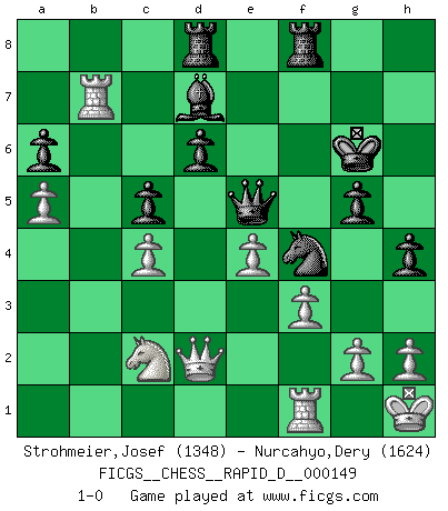 Last move : 1-0 2023 October 23 10:27:2 [Event "FICGS__CHESS__RAPID_D__000149"] [Site "FICGS"] [Date "2023.06.15"] [Round "1"] [White "Strohmeier,Josef"] [Black "Nurcahyo,Dery"] [Result "1-0"] [WhiteElo "1348"] [BlackElo "1624"] 1.e4 e5 2.Nf3 f6 3.Nxe5 fxe5 4.Bc4 Nf6 5.d3 Nc6 6.c3 Bc5 7.a3 d6 8.Bg5 h6 9.Bh4 g5 10.Bg3 Bd7 11.O-O Qe7 12.Nd2 a6 13.b4 Ba7 14.Kh1 h5 15.f3 h4 16.Bf2 O-O-O 17.a4 Bxf2 18.Rxf2 Rhf8 19.Rf1 Nh5 20.b5 Nb8 21.bxa6 Nxa6 22.Bxa6 bxa6 23.Nc4 Nf4 24.Qe1 Bc6 25.Qe3 Kd7 26.d4 Ke8 27.Na5 Ba8 28.c4 exd4 29.Qxd4 Ne6 30.Qd2 Nf4 31.Nb3 Kf7 32.Nd4 Qe5 33.Rad1 Kg6 34.Nf5 Rb8 35.Rb1 Bc6 36.a5 Rbd8 37.Nd4 Bd7 38.Rb7 c5 39.Nc2 1-0 This chess game has been lost on time (started : 2023.06.15 11:52:29) Follow this game move after move (download)Chess demands total concentration. (Bobby Fischer) Offener Brief an US-Präsident Bush anlässlich der Verhaftung Bobby Fishers: Verhaften Sie mich. Stecken Sie mich in dieselbe Zelle wie Bobby Fisher und geben Sie uns ein Schachspiel mit. (Boris Vassilievich Spassky) Yo adoro todas la posiciones. Denme una partida posicional difícil, y la jugaré. Pero posiciones totalmente ganadas, no las tolero. (Hein Donner) Pour se monter efficace, un Cavalier a besoin d'avant-postes ! Les Cavaliers font les meilleurs bloqueurs de pions passés. The large trees attract high winds. (Chinese proverb)