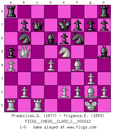 Last move : 1-0 2023 August 1 17:7:43 [Event "FICGS__CHESS__CLASS_C__000312"] [Site "FICGS"] [Date "2023.06.15"] [Round "1"] [White "Pradeilles,Guillaume"] [Black "Trigance,Emile"] [Result "1-0"] [WhiteElo "1877"] [BlackElo "1859"] 1.c4 c6 2.d4 d5 3.Nf3 Nf6 4.Nc3 dxc4 5.g3 Bg4 6.Ne5 Bh5 7.Nxc4 Nbd7 8.Bg2 e6 9.Qb3 Nb6 10.Ne5 Be7 11.a4 a5 12.O-O Qc7 13.Bf4 Bd6 14.Nb5 cxb5 15.Qxb5+ Ke7 16.Rfc1 1-0 Follow this game move after move (download)Becoming successful at Chess allows you to discover your own personality. That's what I want for the kids I teach. (Saudin Robovic) Die unerbitterlichsten Regeln im Schach sind die Ausnahmen. (Savielly Grigorievitsch Tartakower) No hay un Gran Maestro de Ajedrez que sea normal; solo se diferencían ellos por la magnitud de su locura. (Viktor Korchnoi) Il vaut toujours mieux jouer un plan faux de façon logique que de n'avoir pas de plan du tout. (Victor Kortchnoï) Humor is by far the most significant activity of the human brain. (Edward De Bono)