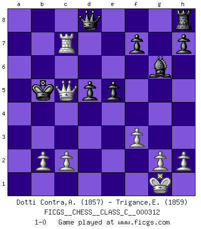 Last move : 1-0 2023 October 10 12:52:37 [Event "FICGS__CHESS__CLASS_C__000312"] [Site "FICGS"] [Date "2023.06.15"] [Round "1"] [White "Dotti Contra,Alessandro"] [Black "Trigance,Emile"] [Result "1-0"] [WhiteElo "1857"] [BlackElo "1859"] 1.e4 c5 2.Nf3 d6 3.Nc3 Nf6 4.Bc4 e6 5.O-O a6 6.a4 Nc6 7.d4 cxd4 8.Nxd4 Bd7 9.Be3 Be7 10.Nxc6 Bxc6 11.a5 Nxe4 12.Nxe4 Bxe4 13.Bb6 Qd7 14.Qd4 Qc6 15.f3 Bg6 16.Qxg7 Kd7 17.Bb3 Rag8 18.Qd4 e5 19.Qd2 Kc8 20.Bd5 Qd7 21.Ra3 Bd8 22.Rc3+ Kb8 23.Bxd8 Qxd8 24.Rb3 b5 25.axb6 Qc8 26.Rc3 Qd8 27.Qe3 Re8 28.Bc6 d5 29.Ra1 Re6 30.Rxa6 Rxc6 31.Rxc6 Kb7 32.Rc7+ Kxa6 33.Qa3+ Kxb6 34.Qa7+ Kb5 35.Qc5+ 1-0 Follow this game move after move (download)Not all artists are Chess players, but all Chess players are artists. (Marcel Duchamp) Lisa Lane, amerikanische Schachmeisterin, hatte Fischer einmal als stärksten lebenden Spieler bezeichnet. Antwort: Das ist richtig, aber Lisa Lane ist eigentlich nicht in der Lage, das zu beurteilen. (Robert James Fischer) Las ideas audaces son como las piezas del Ajedrez que avanzan hacia adelante. Ellas pueden ser vencidas, pero también pueden iniciar una partida victoriosa. (Goethe) Aucun coup ne doit être joué sans but. (Pedro Damiano) The beginning is the most important part of the work. (Plato)